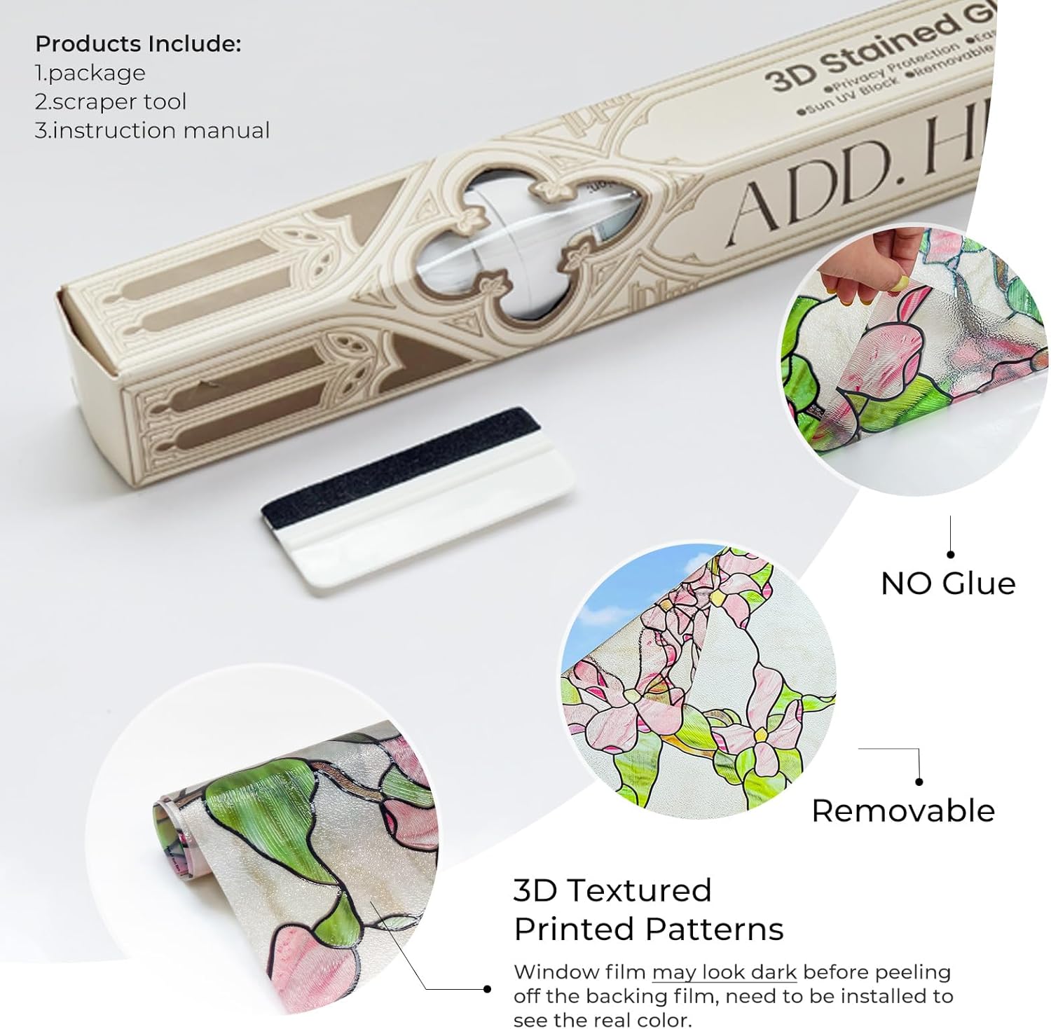 - Easy Installation and Adhesive-Free - Our stain glass film installs easily, no glue needed. Just measure, cut, and apply with water on clean glass. It's residue-free for easy repositioning or removal whenever you want a new look.