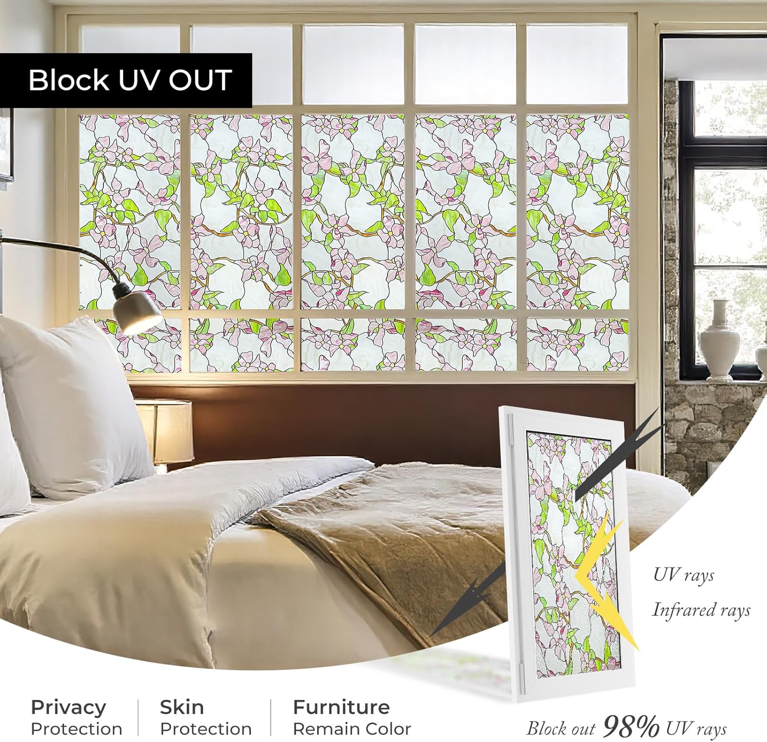 3D Stained Glass Window Film, Decorative Window Privacy Film for Bathroom,Front Door,Home, Sun Blocking Heat Control,Static Cling,23.6inch x 35.4inch Pink sprigs
