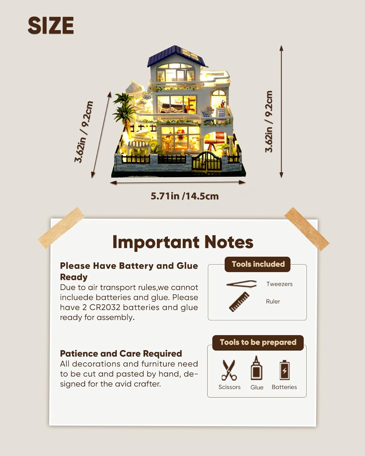 - [Difficulty Description] 𝐏𝐫𝐨𝐝𝐮𝐜𝐭 𝐬𝐢𝐳𝐞:𝟓.𝟕𝟏"𝐋 𝐱 𝟑.𝟔𝟐"𝐖 𝐱 𝟑.𝟔𝟐"𝐇. It takes about 1-3 days to complete this miniature house kit, which is designed for beginners. Please make sure you have enough time and patience to finish this exquisite artwork before you buy it!