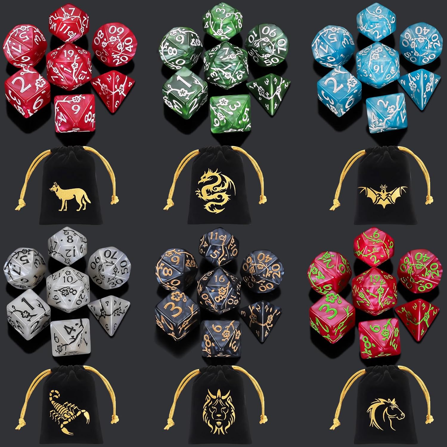CiaraQ Polyhedral Dice Set (42pc) with 6 Drawstring Dice Pouches for Dungeons and Dragons RPG MTG Table Games. 6 Sets of Plum Blossom Pattern Role Playing Dice