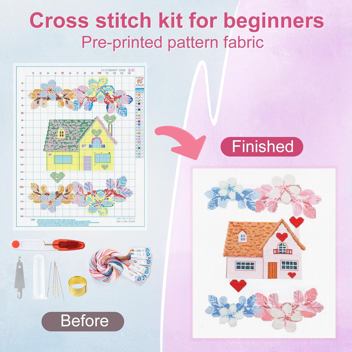 - 【design features】The embroidery kit pink cabin is paired with an orange roof, adorned with red and blue gradient flowers and hearts, creating a sweet and romantic style that can enhance the warm atmosphere of the home.
