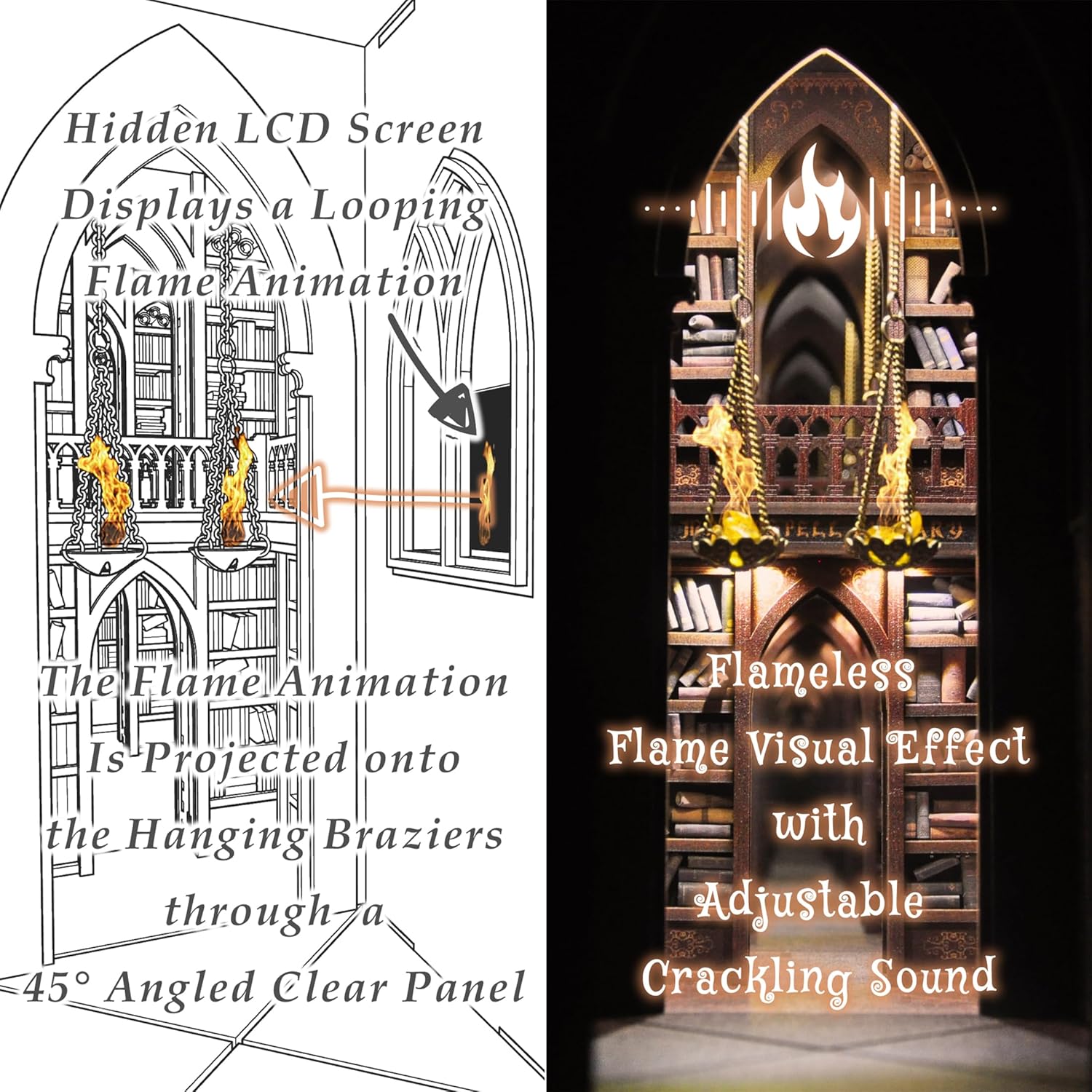 - [Flame Illusion] Includes a high-performance electronic kit with an LCD screen that displays a looping flame effect, projected onto hanging braziers, accompanied by crackling sound and adjustable volume to create a cosy reading atmosphere.