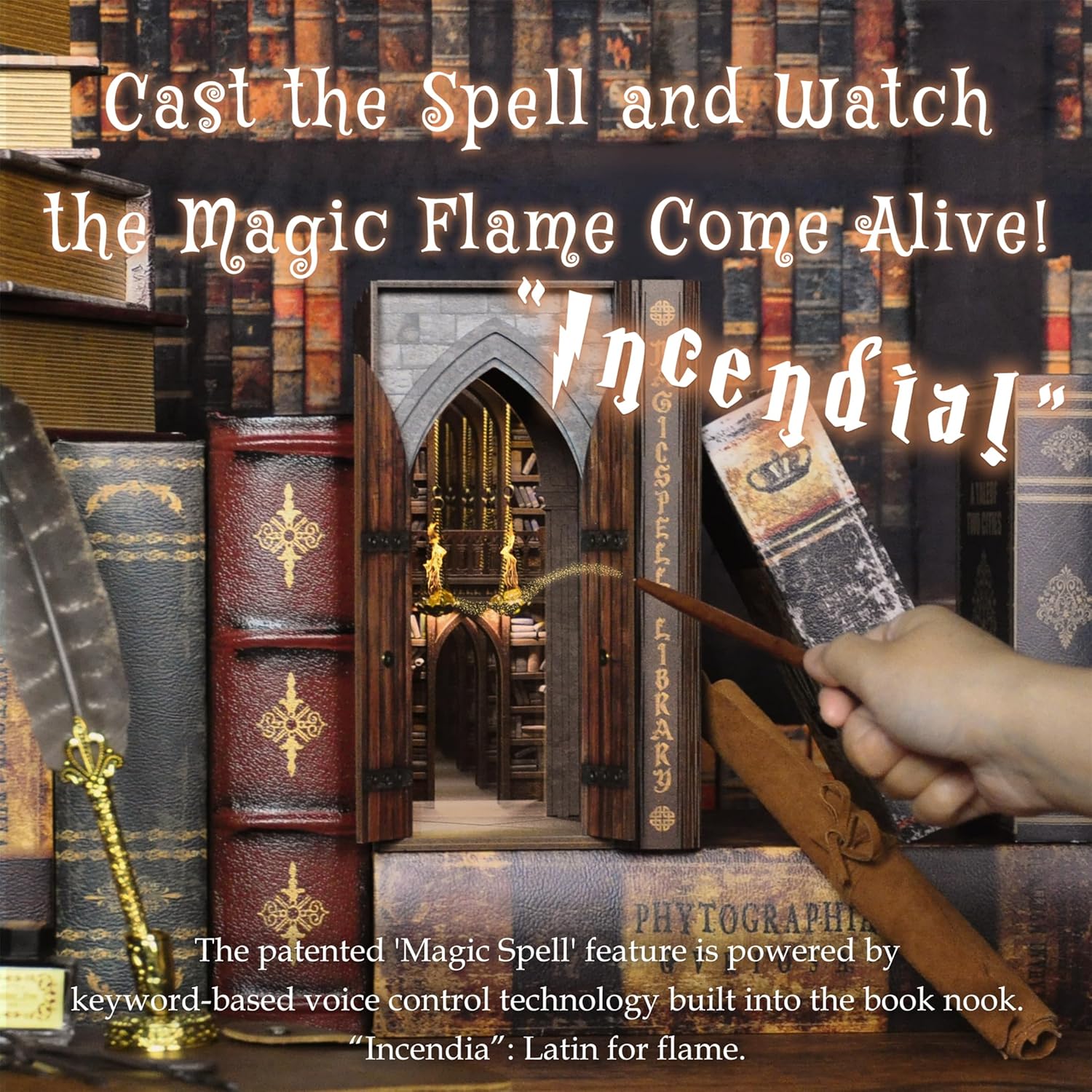 DolphinIsle Book Nook Kits for Adults, DIY Booknook Bookshelf Decor Magic Spell Library with Flame Illusion