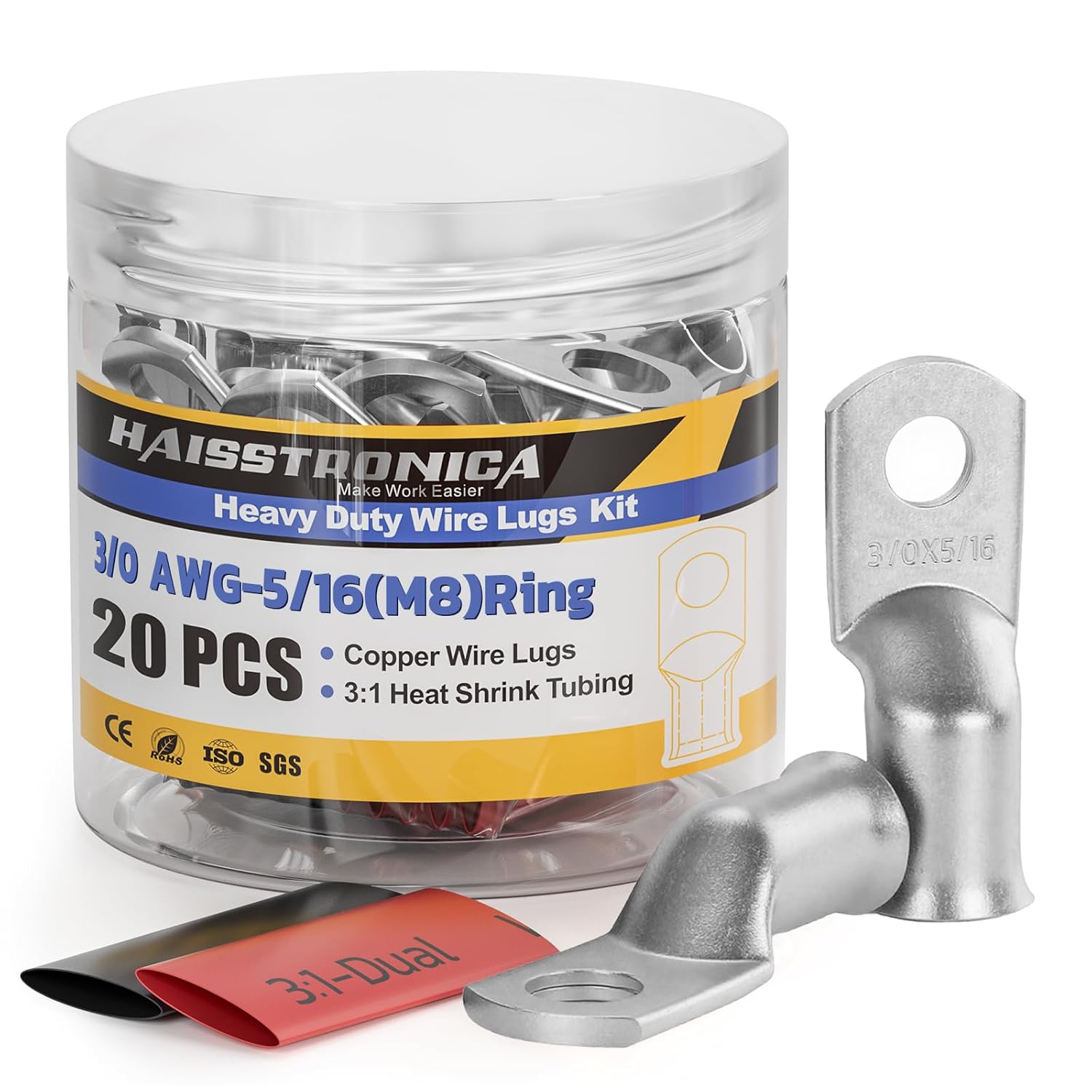 haisstronica 10pcs 3/0 AWG - 5/16"(M8) Tinned Copper Battery Lugs