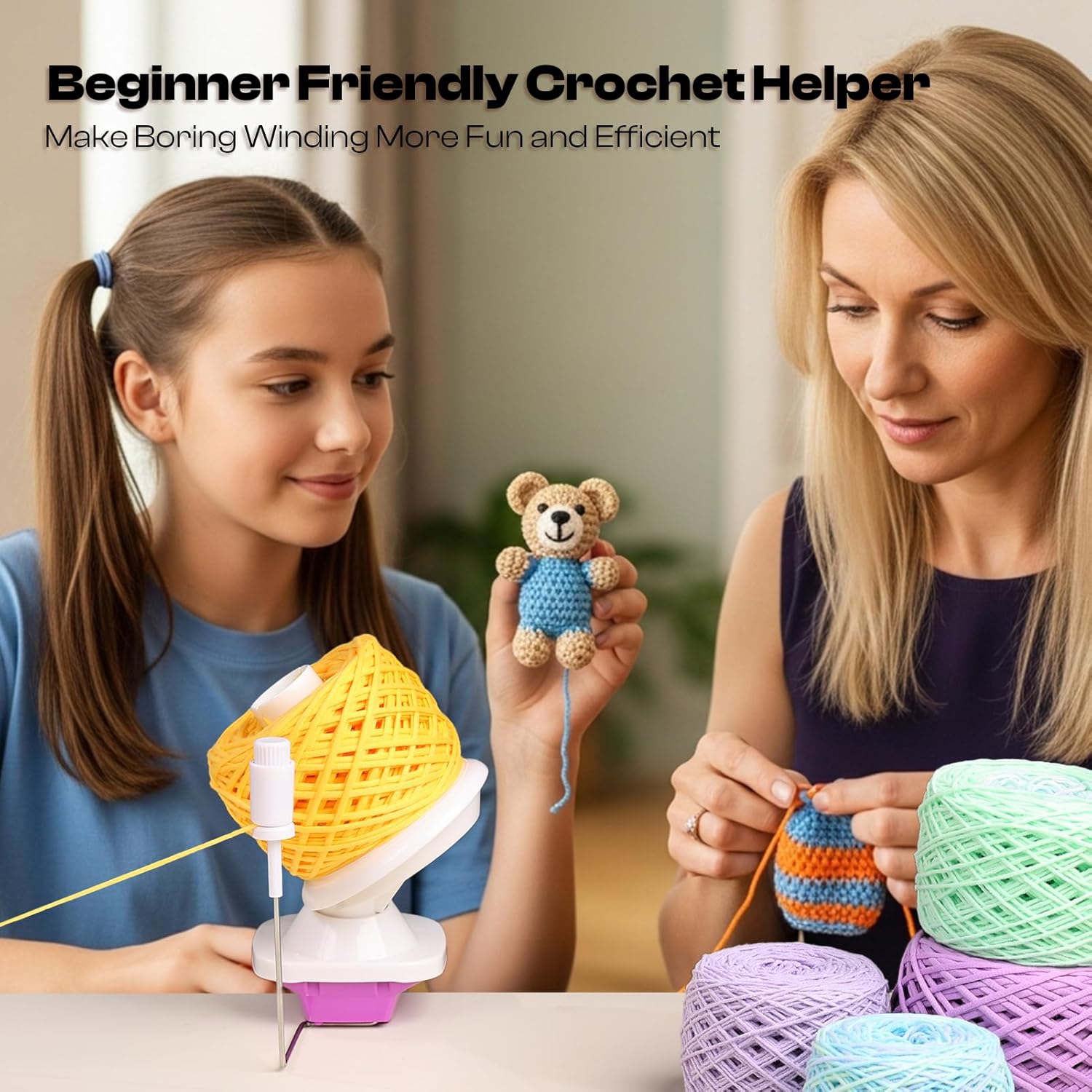 - Quick Setup&Beginner-Friendly: No complicated assembly needed! Our yarn winder for crocheting is ready to use right out of the box. Just attach to any table edge or surface up to 1-1/2" thick, twist on the spindle, position the guide arm and start winding. Comes with a detailed full-color instruction manual to get you started with the yarn winder faster