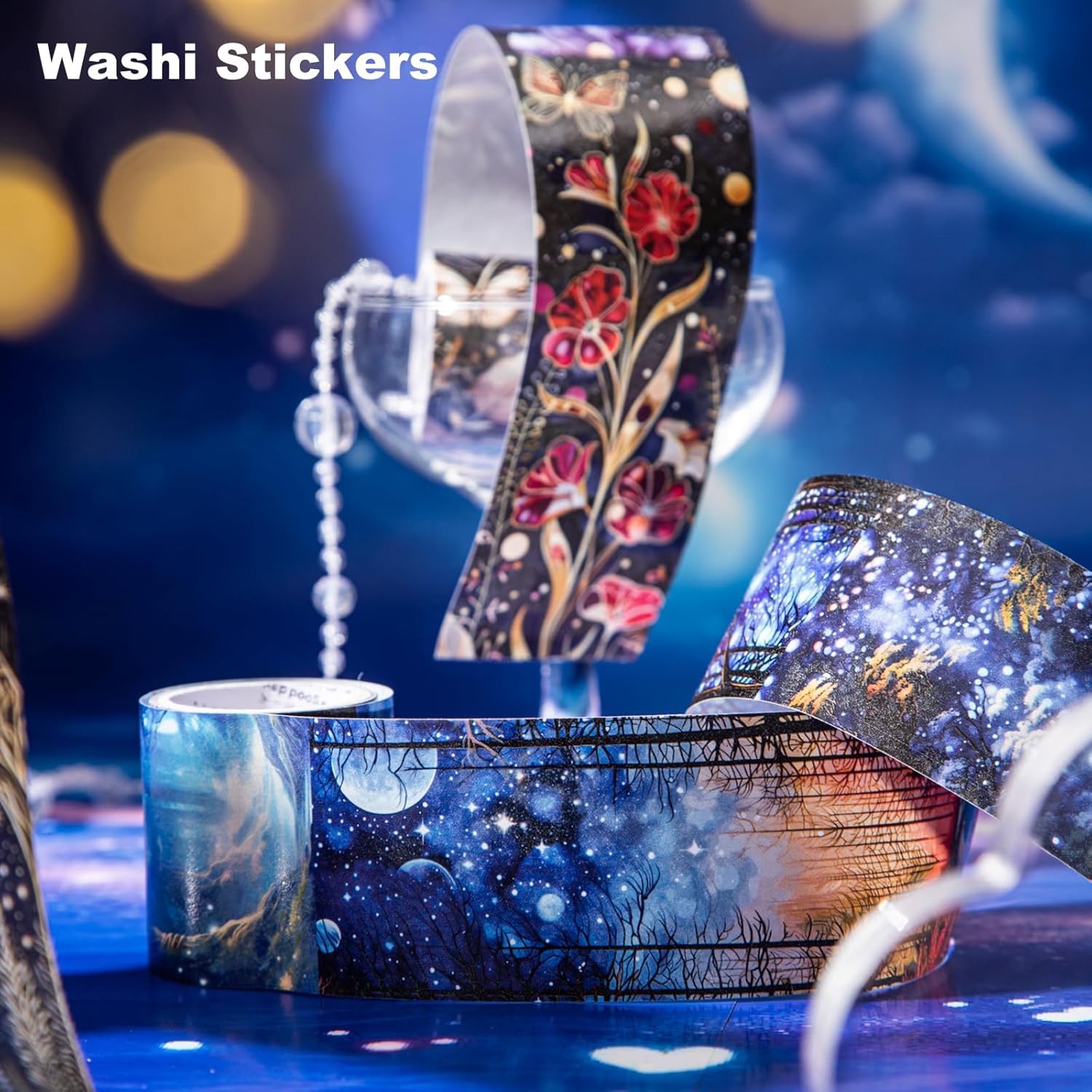 6 Rolls Fantasy Washi Tape Set – Non-Repeat Magical Forest and Galaxy Designs for Scrapbooking, Journaling, Planner, DIY Crafts with Storage Clip