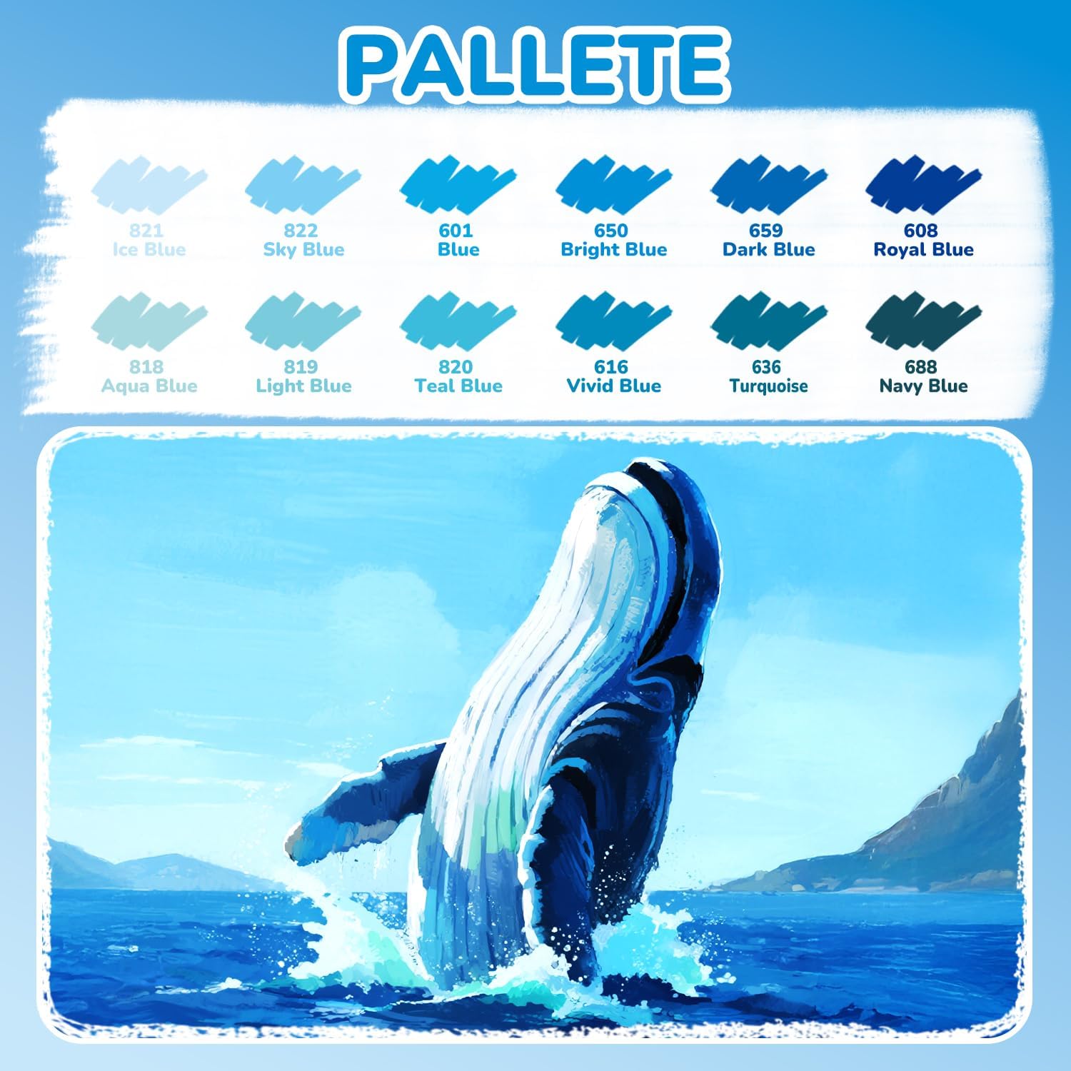 Guangna 12 Blue Dual Tip Acrylic Paint Markers, Brush Tip & Chisel Tip Acrylic Paint Pens for Rock, Wood, Glass, Paper, Coloring Book, Ceramic, Canvas, Water-Based Ink