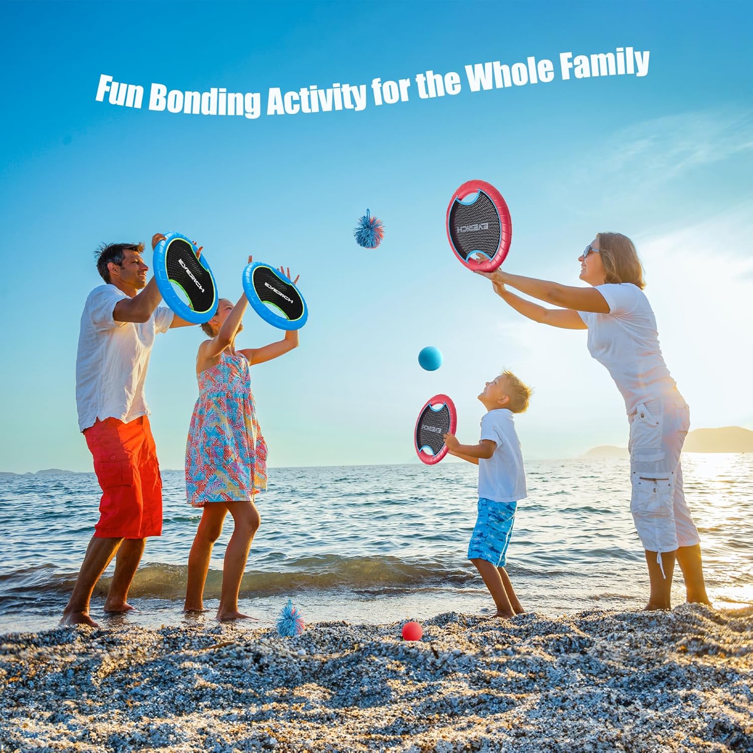 EVERICH TOY Trampoline Paddle Ball Set with 2 Bouncy Paddles & 4 Balls - Soft Foam Design for Kids Play Indoor Outdoor Beach Backyard Lawn - Great Gift Idea for Boys & Girls (Blue & Red)