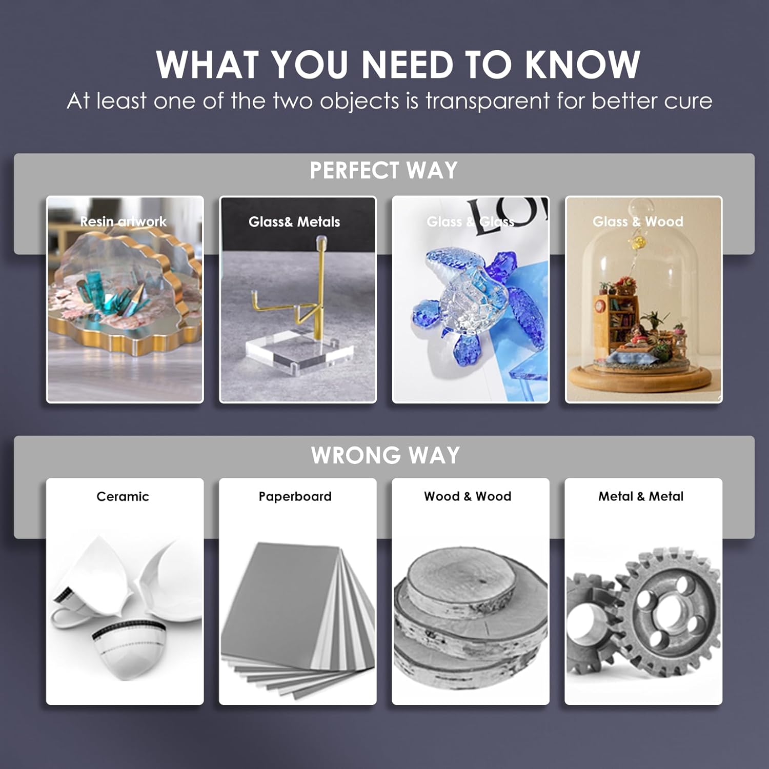- 【Multi-Purpose】- Our UV resin kit with light is designed for bonding small ornaments with transparent objects such as resin, acrylic, glass, etc., and also be used for welding between glass, metal and plastic. For better curing, we strongly recommend one of the two objects should be transparent at least.