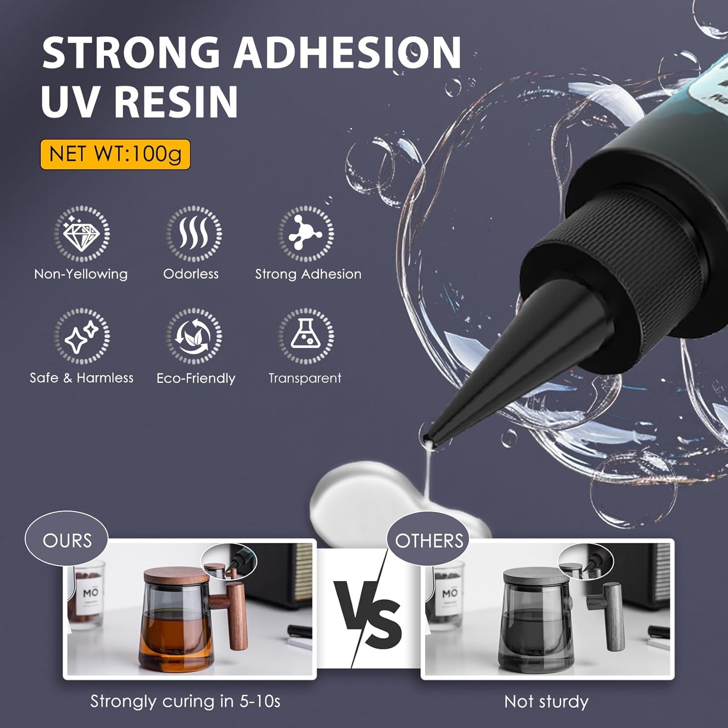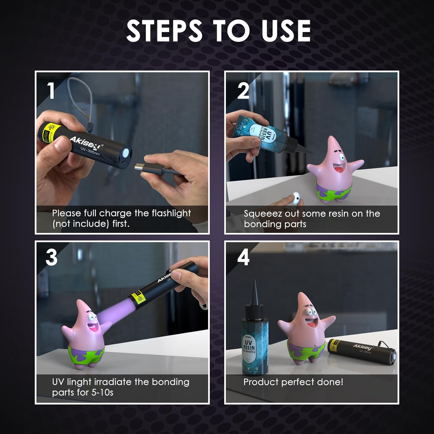 - 【100g UV Resin for bonding】 - Akisey UV resin has low viscosity and strong adhesive. Under the irradiation of 395nm UV flashlight(NOT INCLUDED), the UV resin can fast cured in just 5-10s.