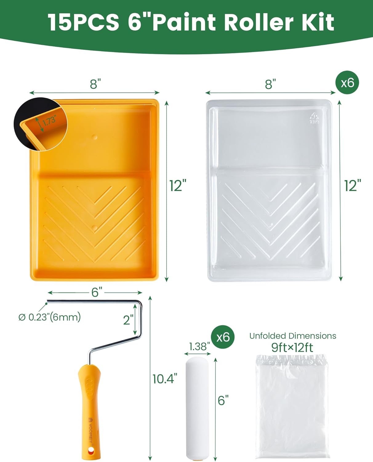 voomey 15 Pcs 6 Inch Paint Roller Kit with Small Paint Roller, Paint Tray with Liners, Foam Paint Roller for Painting Door, Walls, Cabinet