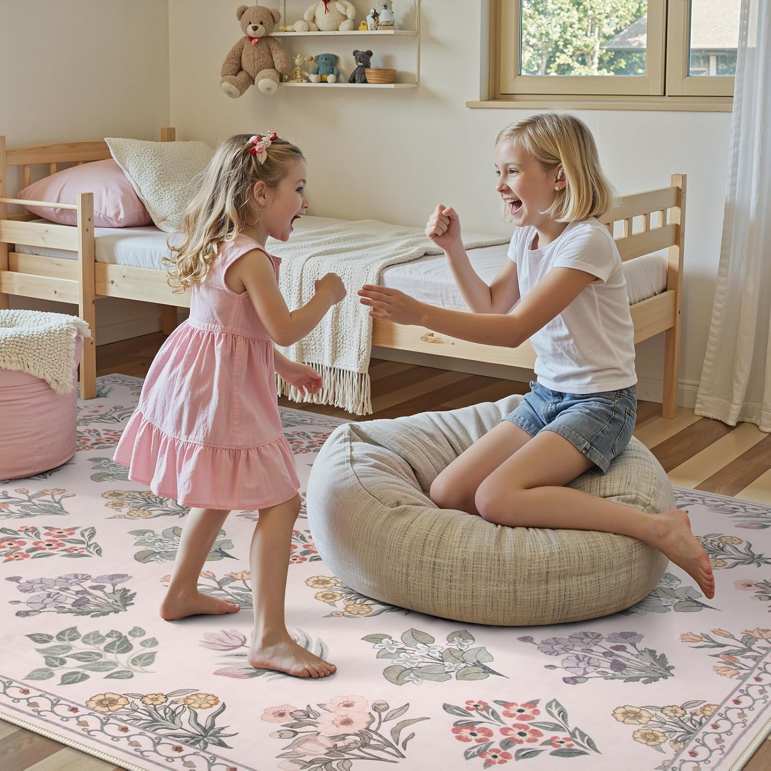 Wonnitar Pink Rugs for Bedroom Girls Nursery, Washable 5x7 Floral Rug, Boho Ultra-Thin Non Slip Soft Indoor Decor Carpet for Kids Room Playroom Living Room Dorm, Pale Pink