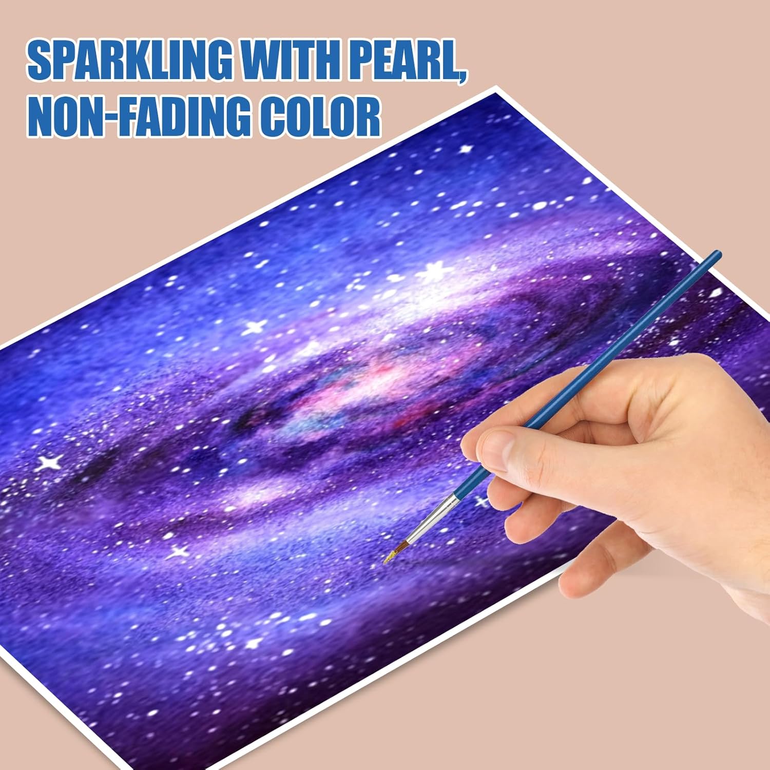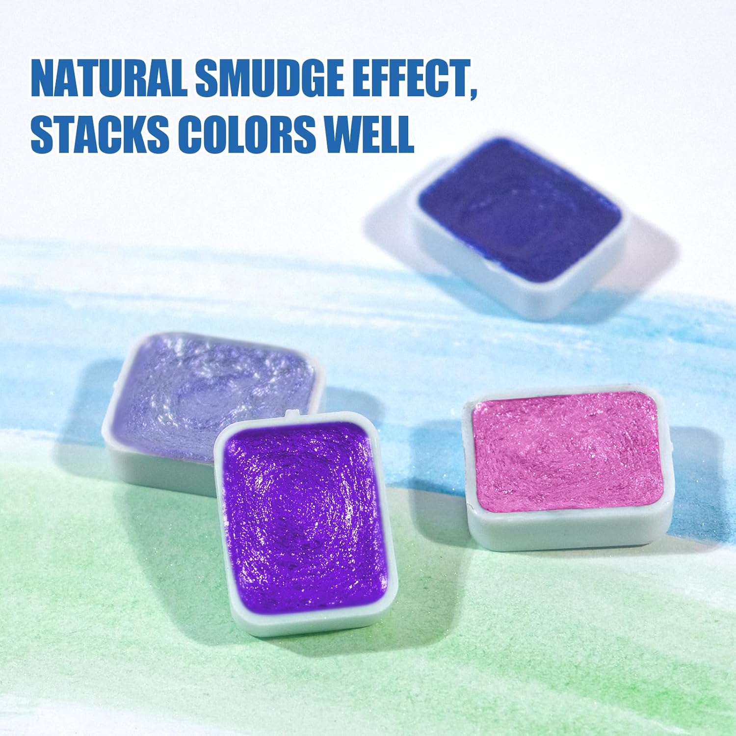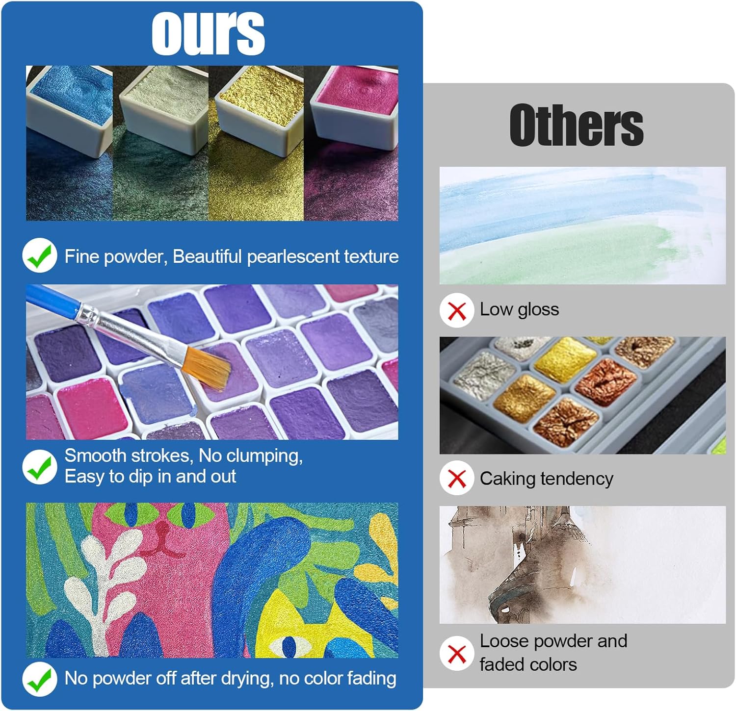 - 【Smooth Strokes, No Powder Off】Our watercolors paint set are extremely durability. Glitter watercolor remain highly stable, drying without crumbling or fading, making the watercolor painting shine forever. The fine powder texture makes the strokes of the pearl paint smooth and resists clumping