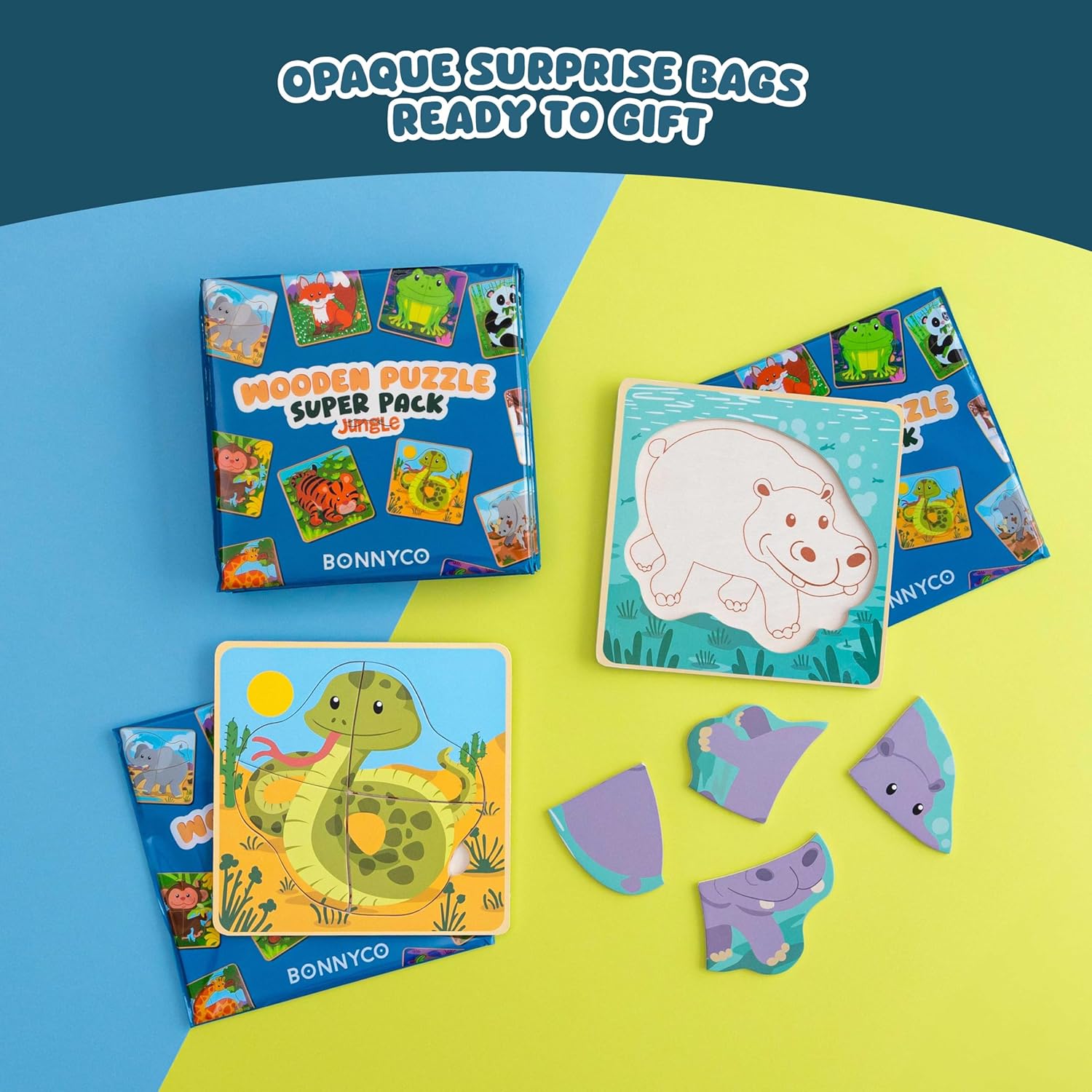 - PACK OF 16 WOODEN PUZZLES - Each 5.7" x 5.7" x 0.2" puzzle for toddlers aged 10 months and up contains 4 pieces, a sealed opaque bag, and a different animal design