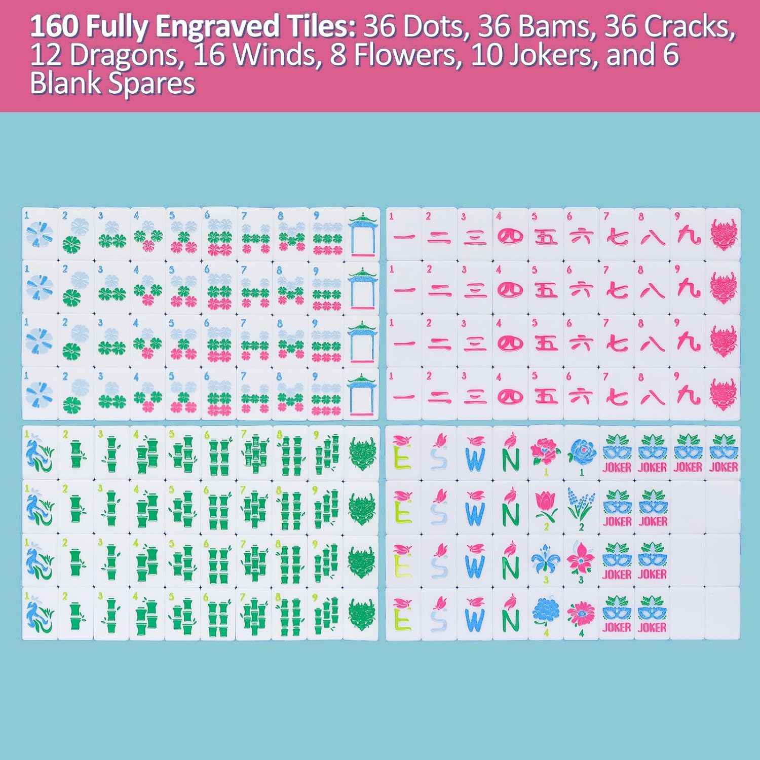 - Complete 160 American Mahjong Set: Includes 36 Dots, 36 Bams, 36 Craks, 12 Dragons, 16 Winds, 8 Flowers, 10 Jokers, and 6 Blank Spares. Fully compatible with American Mahjong rules and gameplay.