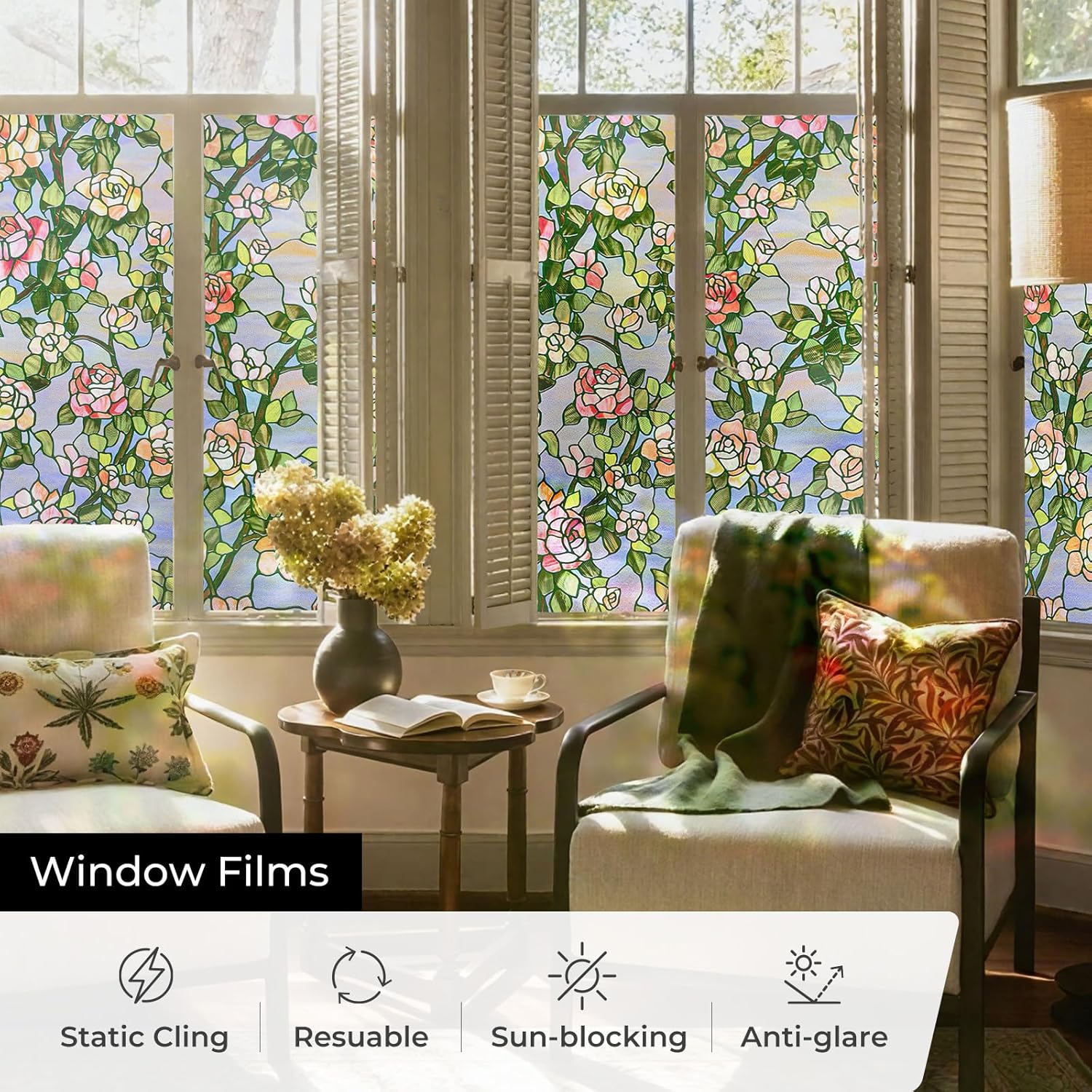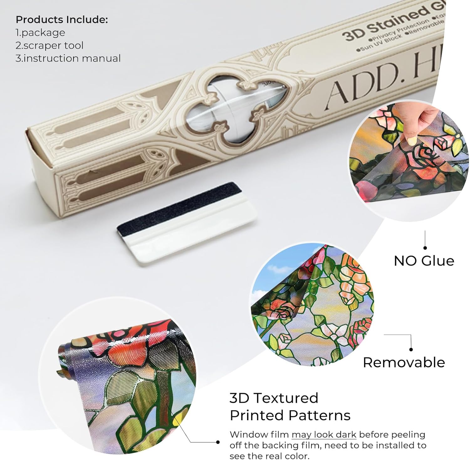 - Easy Installation and Adhesive-Free0 -Our stain glass film installs easily, no glue needed. Just measure, cut, and apply with water on clean glass. It's residue-free for easy repositioning or removal whenever you want a new look.