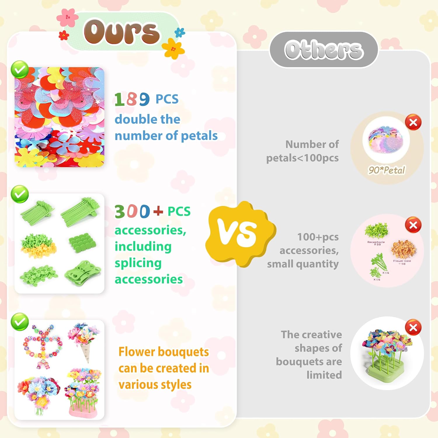 - 🧠【STEM Enlightenment, Education and Entertainment】In interesting play, comprehensively exercise children's hands-on ability, hand-eye coordination ability and concentration. From design, color matching to assembly, every step inspires children's artistic creativity and logical thinking. DIY Bouquet Kit is the ideal educational toy for kids