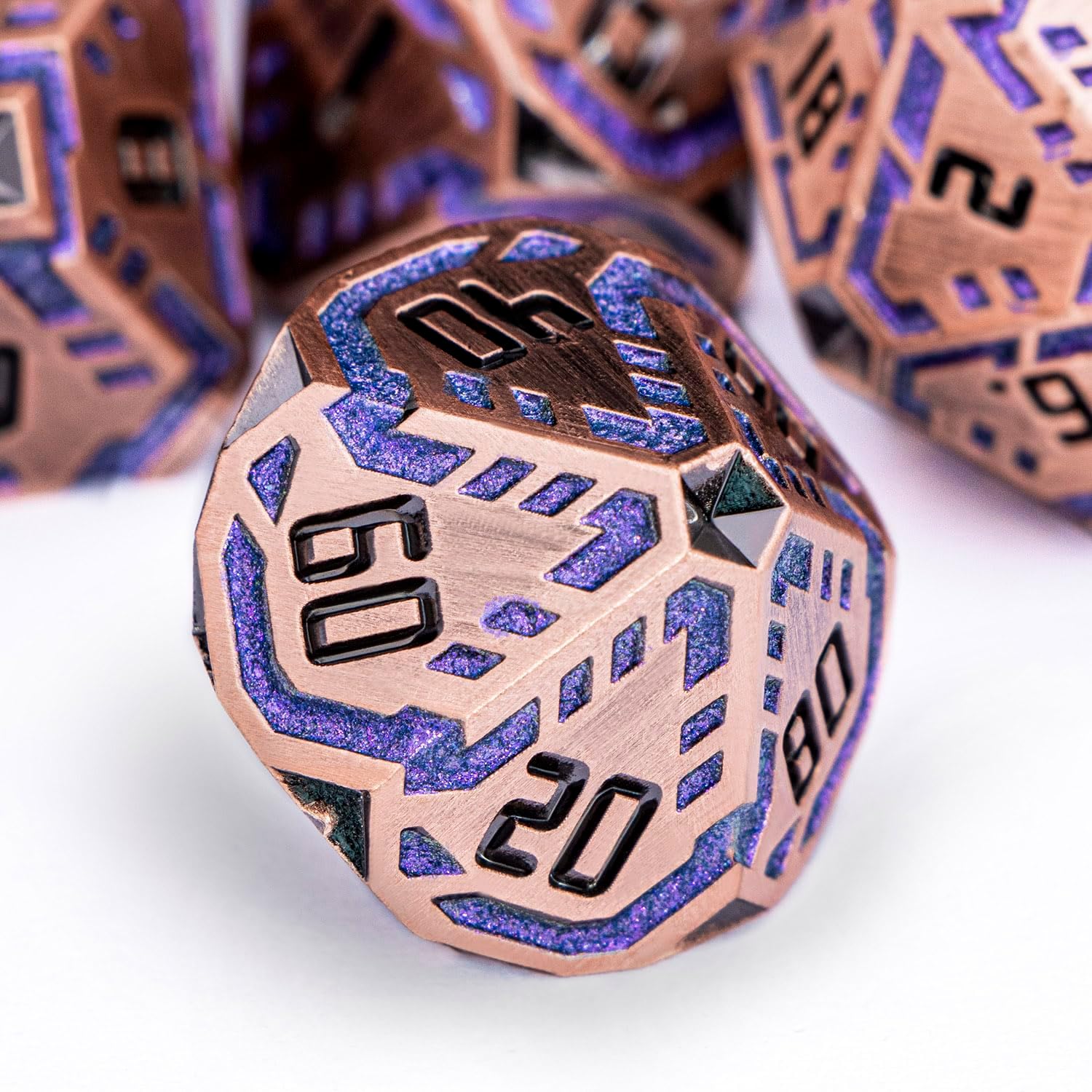 Metal DND Sci-fi Dice Set 7PCS Stripe Polyhedral Dice for Dungeons Dragons RPG Role Playing Game, Glitter D and D Dice with Gift Box D6 D8 D10 D12 D20 (Ancient Bronze&Purple)
