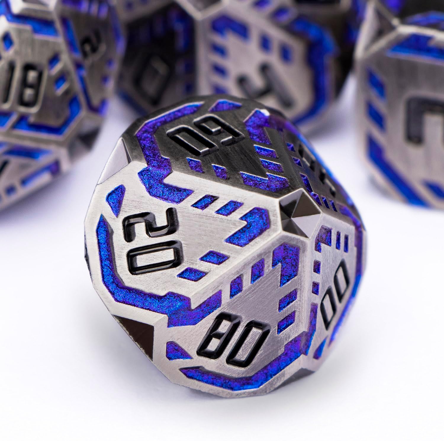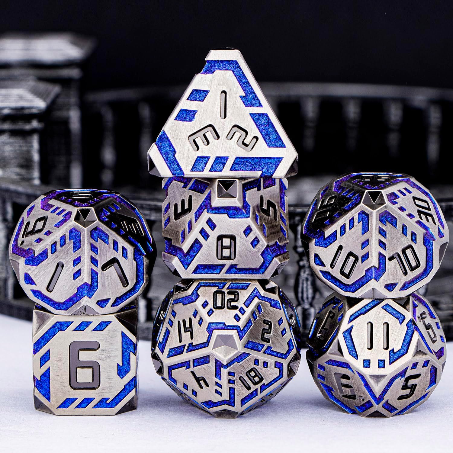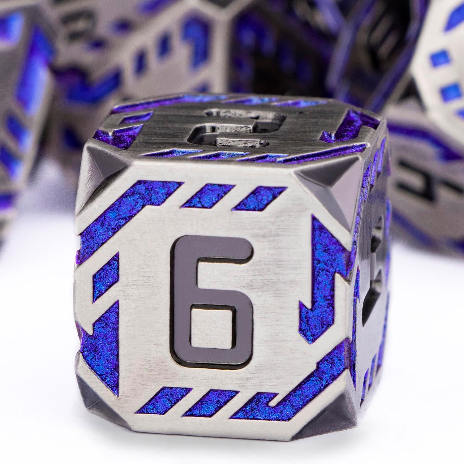 Metal DND Sci-fi Dice Set 7PCS Stripe Polyhedral Dice for Dungeons Dragons RPG Role Playing Game, Glitter D and D Dice with Gift Box D6 D8 D10 D12 D20 (Blue Purple&Grey)