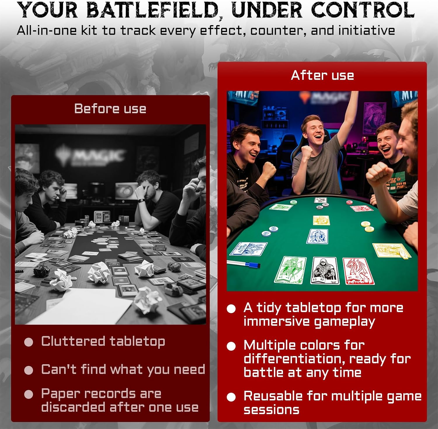 - š® YOUR BATTLEFIELD, CRYSTAL CLEAR Color-code with 5 markers (green/black/red/blue/yellow): Use arrow tokens for enchantments, round counters for poison/+1/-1, and acrylic tags for commander damage. End board state confusion forever.