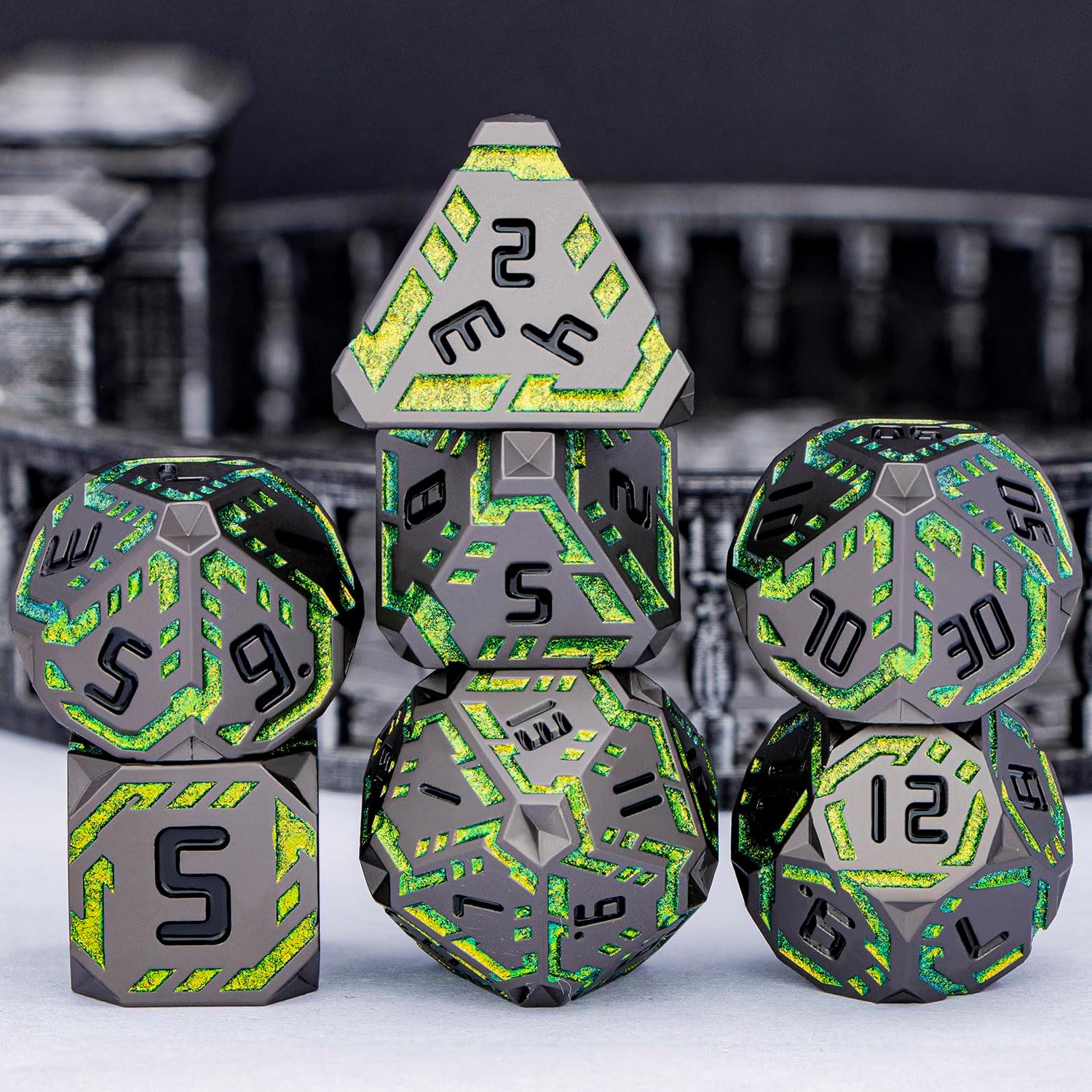 Metal DND Sci-fi Dice Set 7PCS Stripe Polyhedral Dice for Dungeons Dragons RPG Role Playing Game, Glitter D and D Dice with Gift Box D6 D8 D10 D12 D20 (Black&Green Yellow)