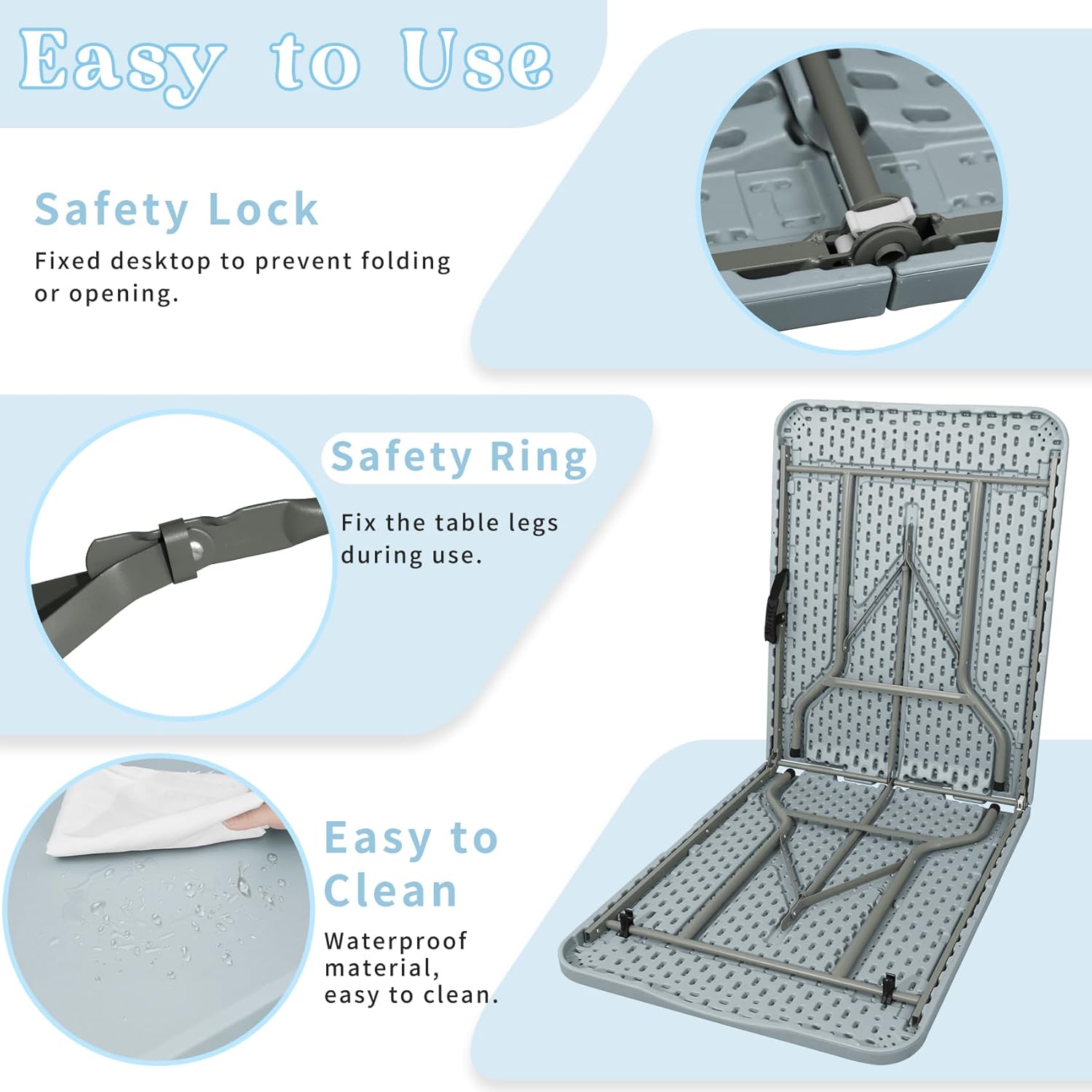 - 5 FT Folding Tables: You will receive heavy-duty folding tables measuring 5 ft/60 inches in length, 2.3 ft/27.5 inches in width, and 2.4 ft/29.1 inches in height. The tabletop of the table is made of high-density polyethylene material, and the support and legs of the table are made of high-quality metal steel, which is not only sturdy and durable, but also structurally stable and not easy to shake.