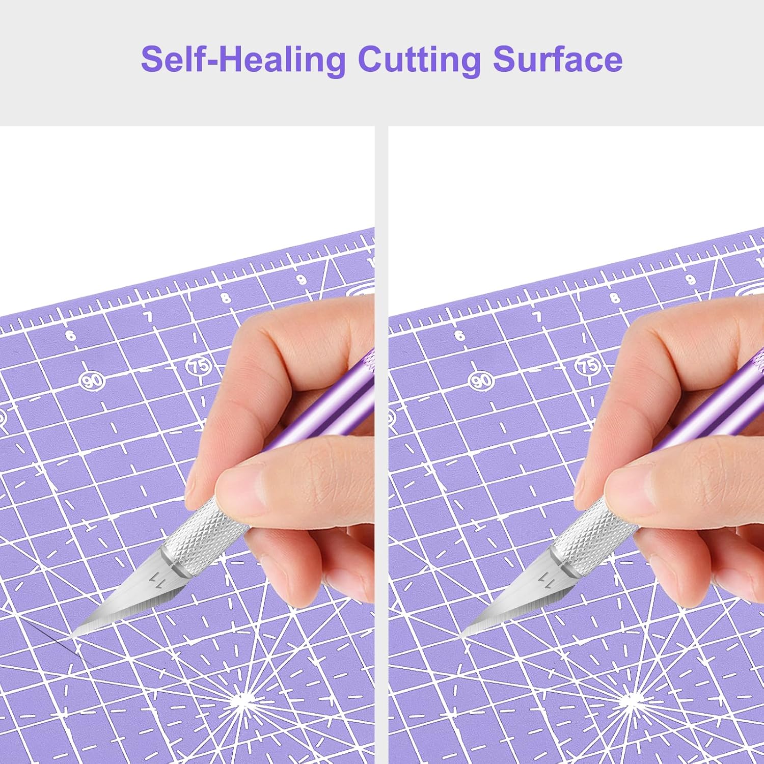 - [Self-healing Cutting Surface] ♡Self healing cutting mat: Made of high-quality PVC, this mat features advanced self-healing properties that protect your cutting tools and work surface. The self-healing nature of the mat's surface compound resealing of minor cuts and blade marks, maintaining a long-lasting smooth surface.