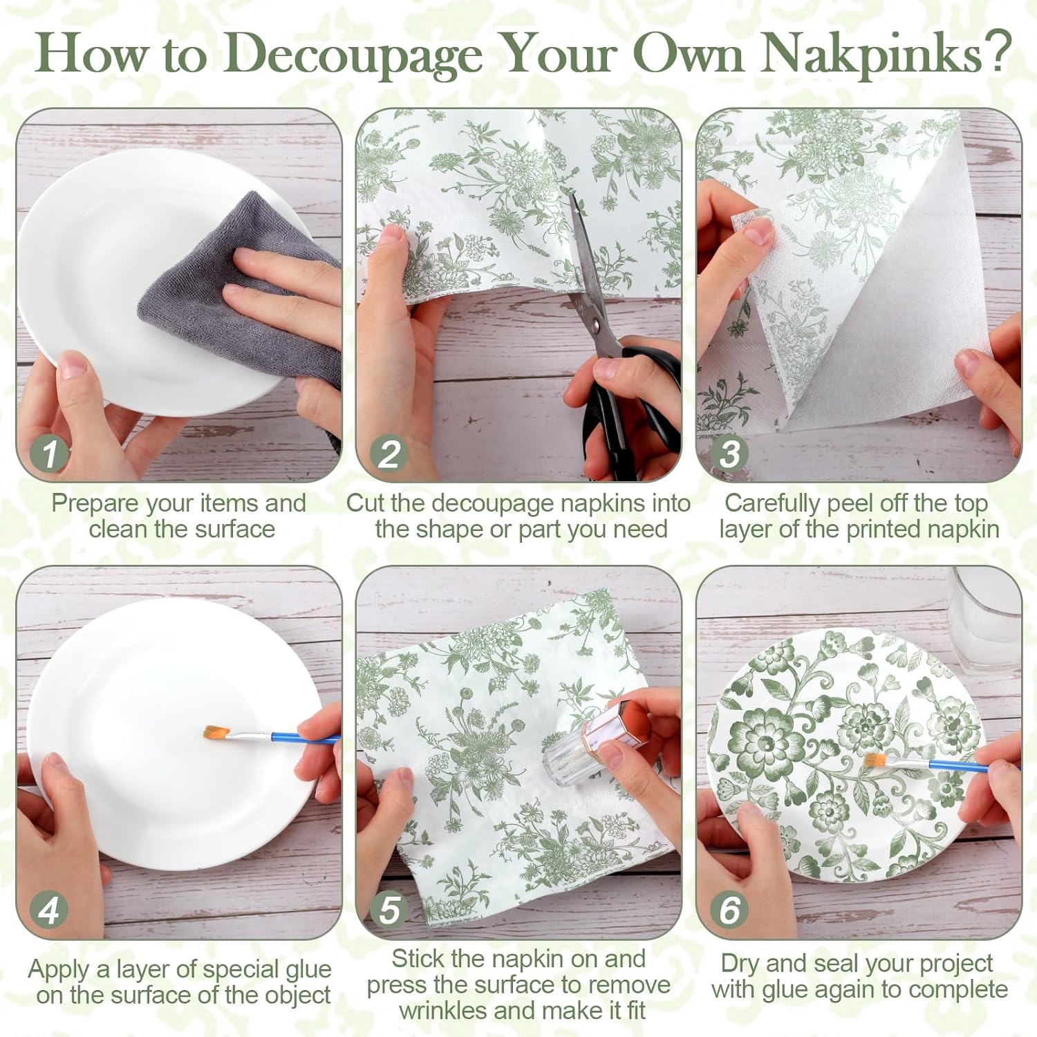 - 6 Styles to Choose: this collection features 36 sage green decoupage napkins showcasing 6 different floral designs, 6 pcs per design, easily meet your daily use and replacement needs, you can also share them with family and friends