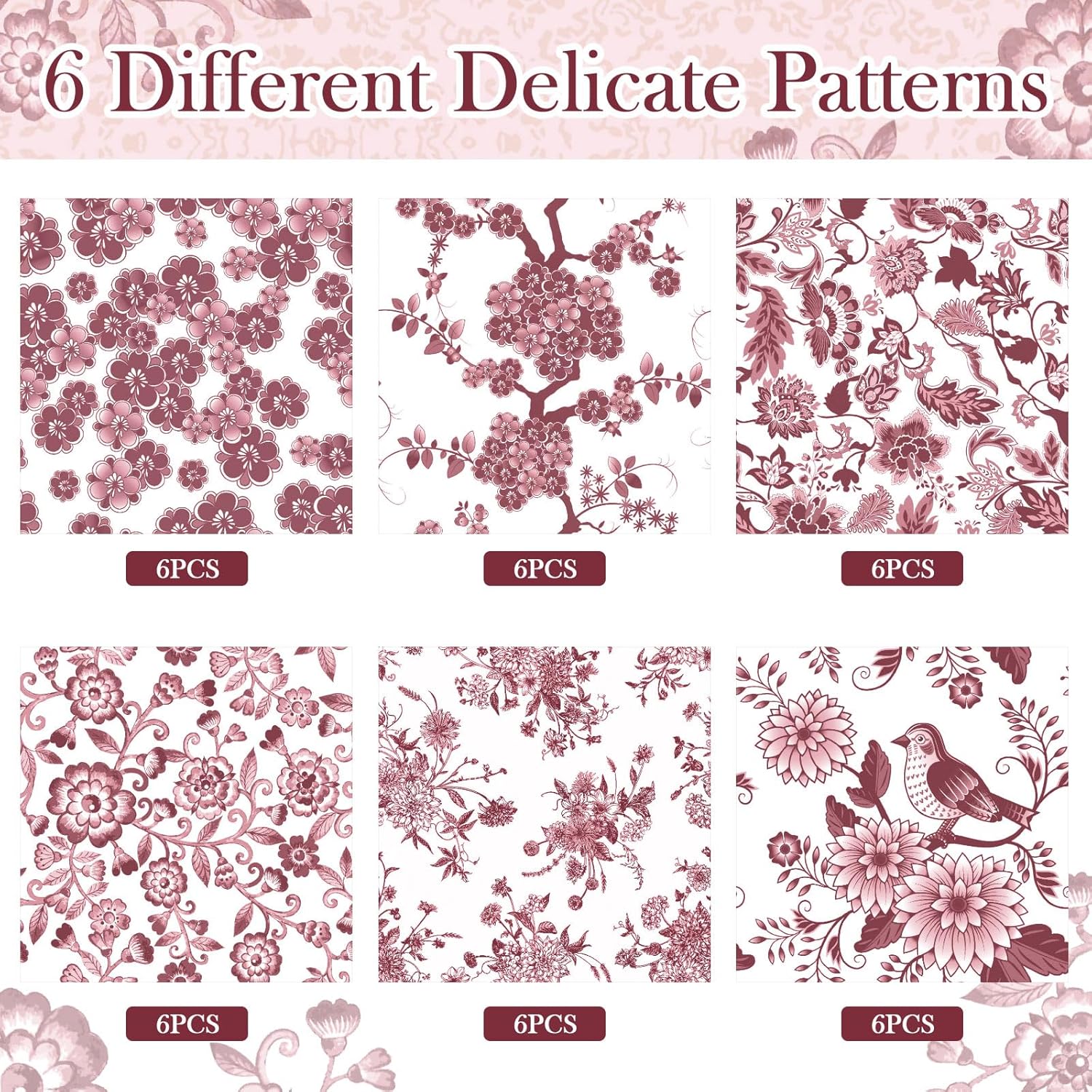 - 6 Styles to Choose: this collection features 36 decoupage napkins showcasing 6 distinct red and white floral designs, 6 pcs per design, easily meet your daily use and replacement needs, you can also share them with family and friends
