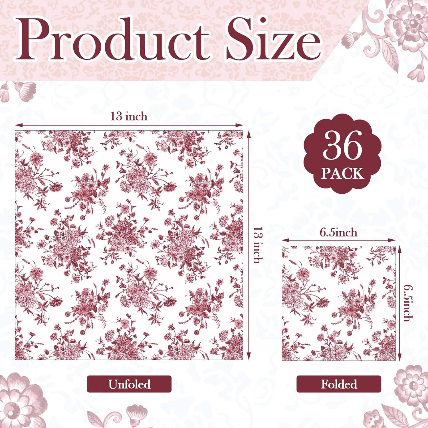 Epakh 36 Pack 6 Style Burgundy Decoupage Paper Napkins Assorted Floral Decorative Decoupage Napkin Chinoiserie Cocktail Paper for DIY Crafting Fall Christmas Wedding Party Decor, Each Unfolded 13''