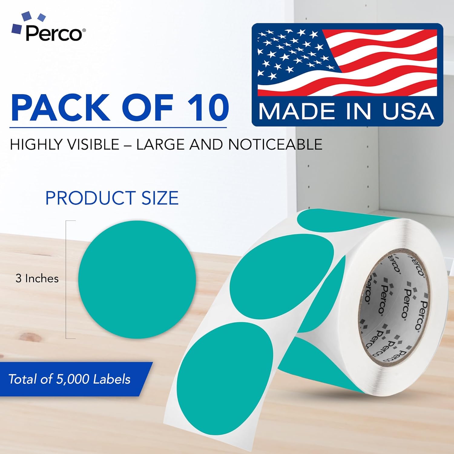 Perco Teal 3-Inch Perforated Circle Dot Sticker Labels — 10 Rolls, 5,000 Round Stickers — with Permanent Adhesive for Moving Boxes, Sale Signage, Displays, Status Messaging—Made in USA