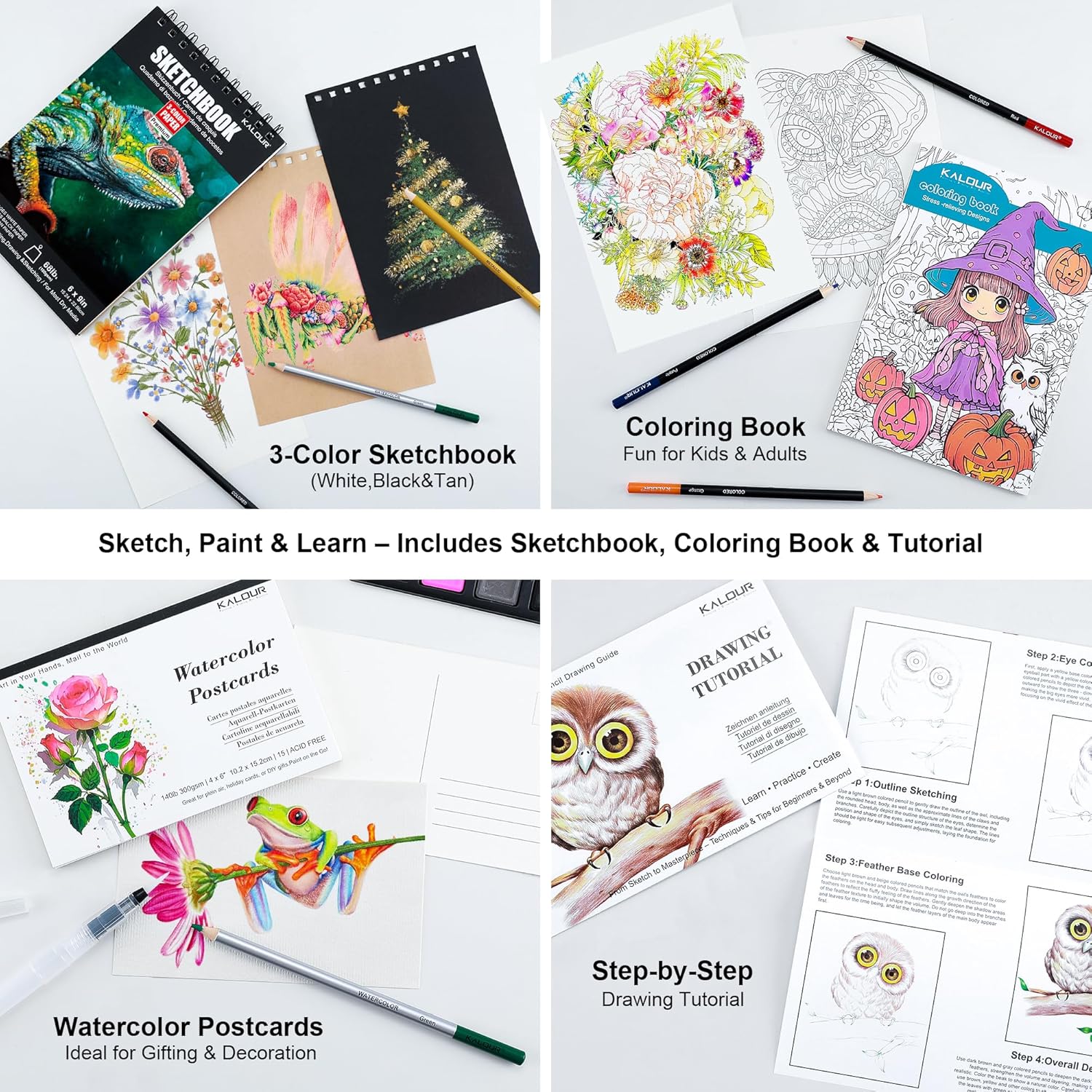 - Creative Extras Included – Comes with a 50-page 3-color sketchbook, 20-page coloring book, 15 watercolor postcards, and a step-by-step drawing tutorial. Perfect for practicing techniques, relaxing with coloring, or sharing your art as gifts.