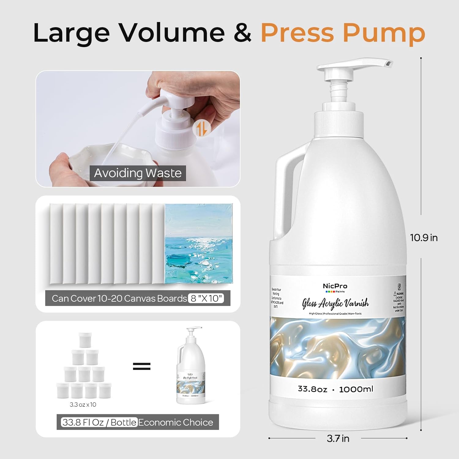 Nicpro Gloss Varnish for Acrylic Painting, 33.8oz Bottle with Pump, Non-Yellowing, Non-Toxic, Anti-Crazing, Clear Acrylic Varnish for Artist, Hobby Painter on Canvas Artwork, Wood, High Gloss Finish