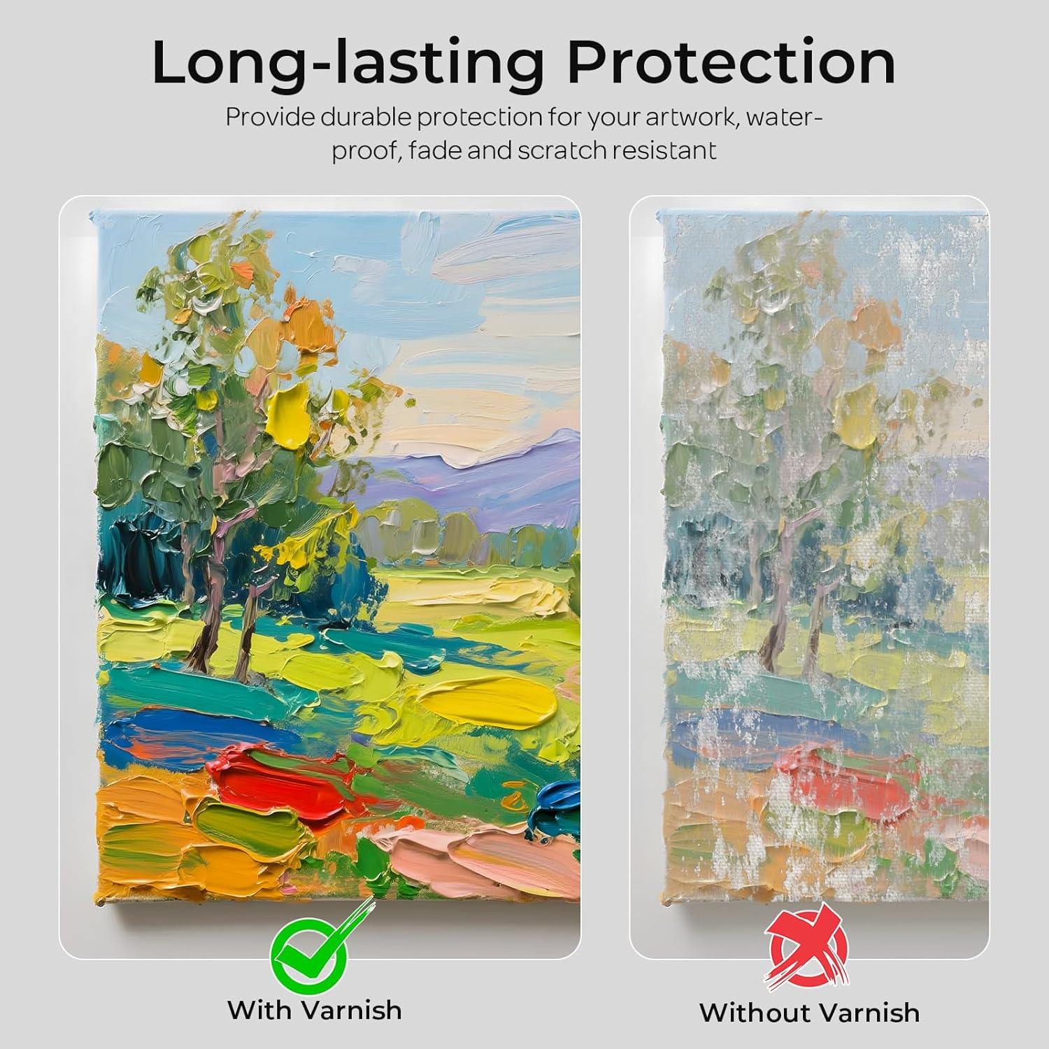 - Recommended Uses For Product : 1. Ensure that the artwork is completely dry and the surface is clean; 2. Apply the varnish with long even strokes using the soft brush provided, applying 2-3 thin coats (allow 1-2 hours for each coat to dry); 3. Final drying: Place your painting horizontally and allow it to dry for 24 hours to prevent drips. 1. Ensure that the artwork is completely dry and the surface is clean; 2. Apply the varnish with long even strokes using the soft brush provided, applying 2-3 th⦠See more
