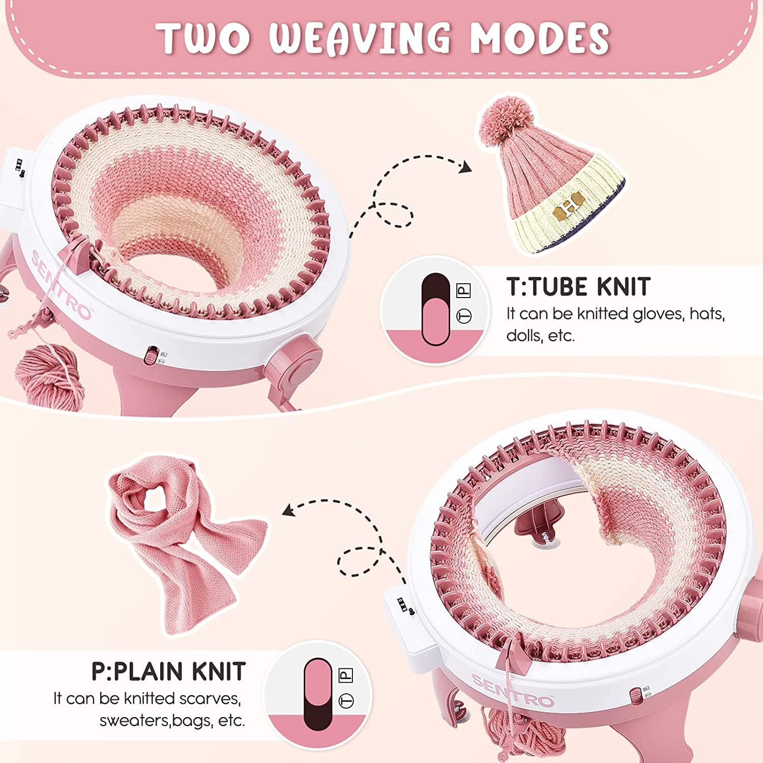 - Delights of knitting: The SENTRO knitting machines Perfect for beginner knitters,Create a flat or round stitch in seconds with hand crank .Just thread the weaving loom yarn into the spindles and turn the crank to knit your very own masterpieces while developing your hand-eye coordination.Suitable for children over 12 years of age.