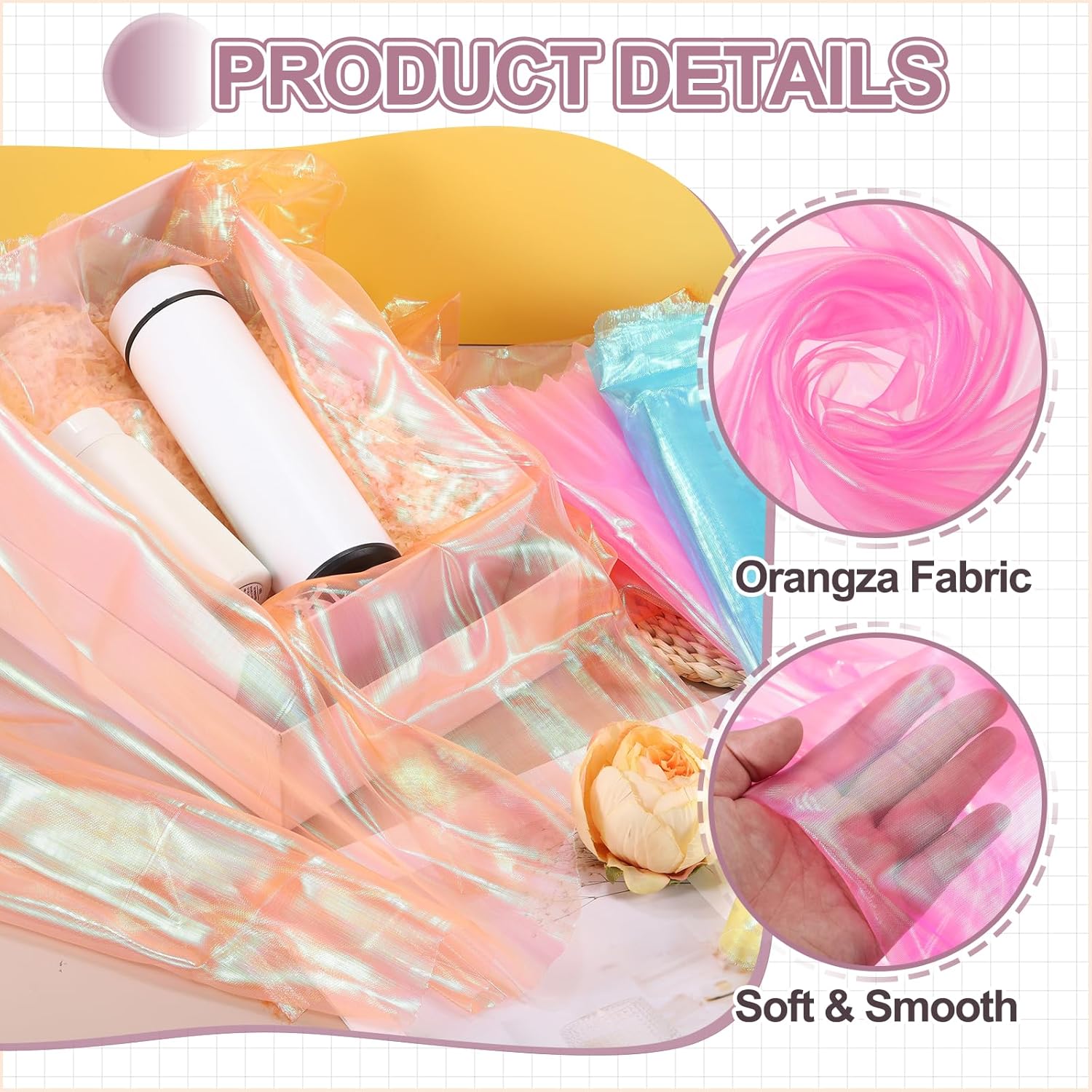 - Elevate your creative vision with this iridescent organza fabric, blending functionality and elegant beauty. Perfect for bridal wear, home decoration, curtains, table runners, event backdrops, floral arrangements, and DIY crafts.
