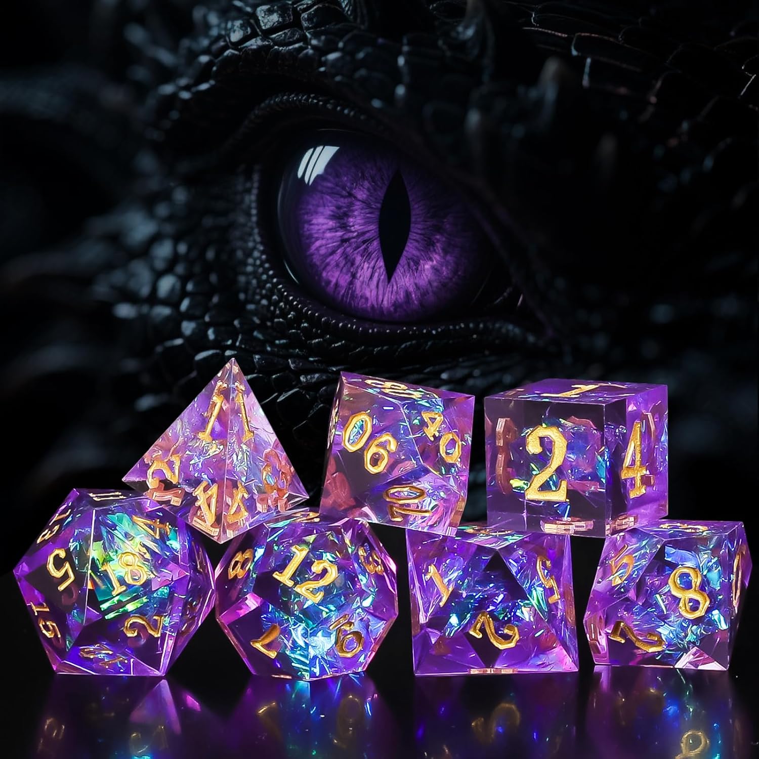 QMAY Resin Mystery Dice Set, 7 Pcs Handmade Sharp Edge Polyhedral Dice, Random Various Styles DND Dice & Dice Bag, DND Gifts, Suitable for Dungeons and Dragons, RPG, MTG,Role Playing Table Game