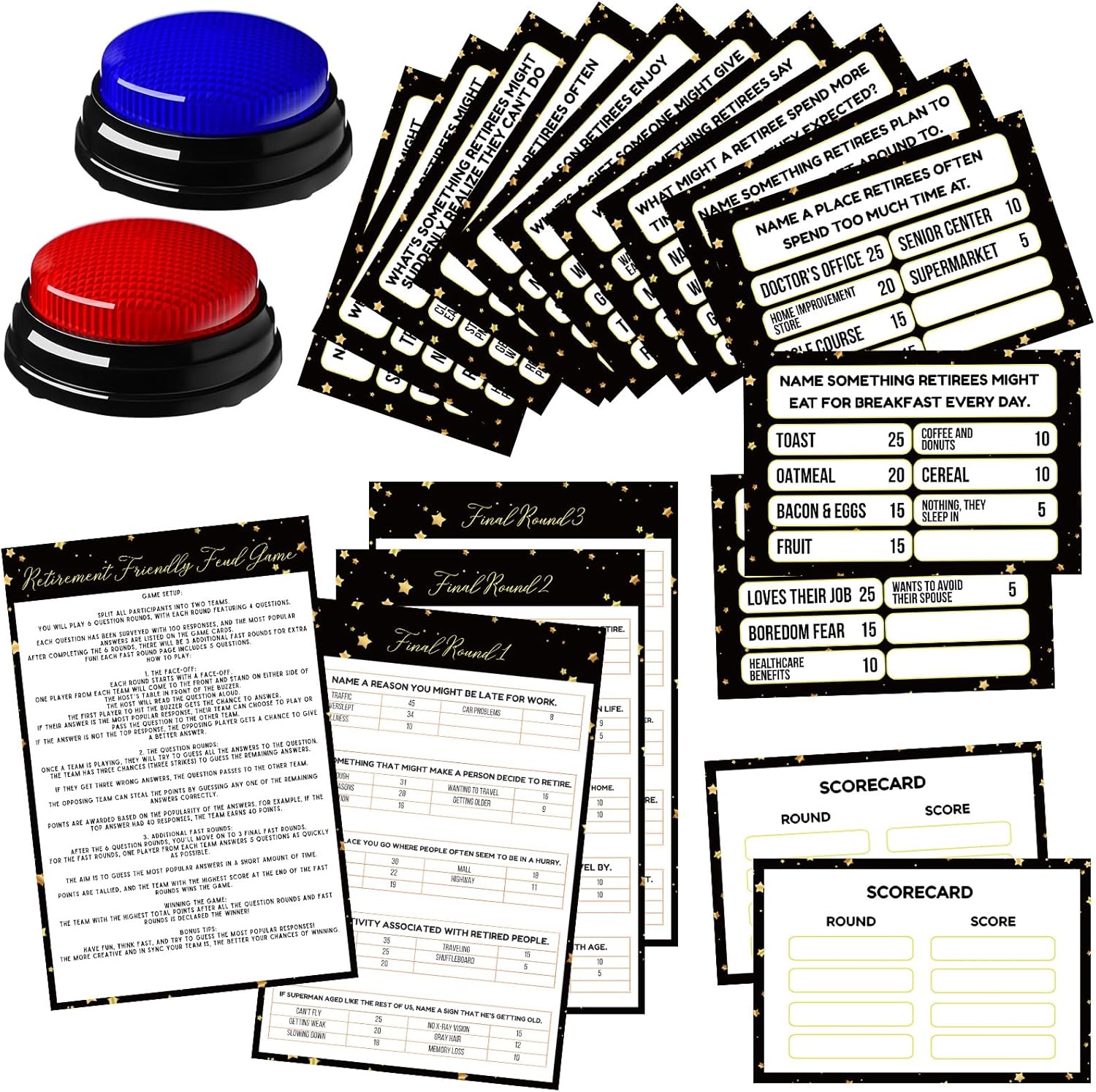 - Retirement Friendly Feud Game Set: enjoy a lively retirement trivia night with our complete set, includes 1 game instruction card, 2 score cards, 20 retirement theme question cards and 5 quick final game cards, 28 cards in total for non-stop fun