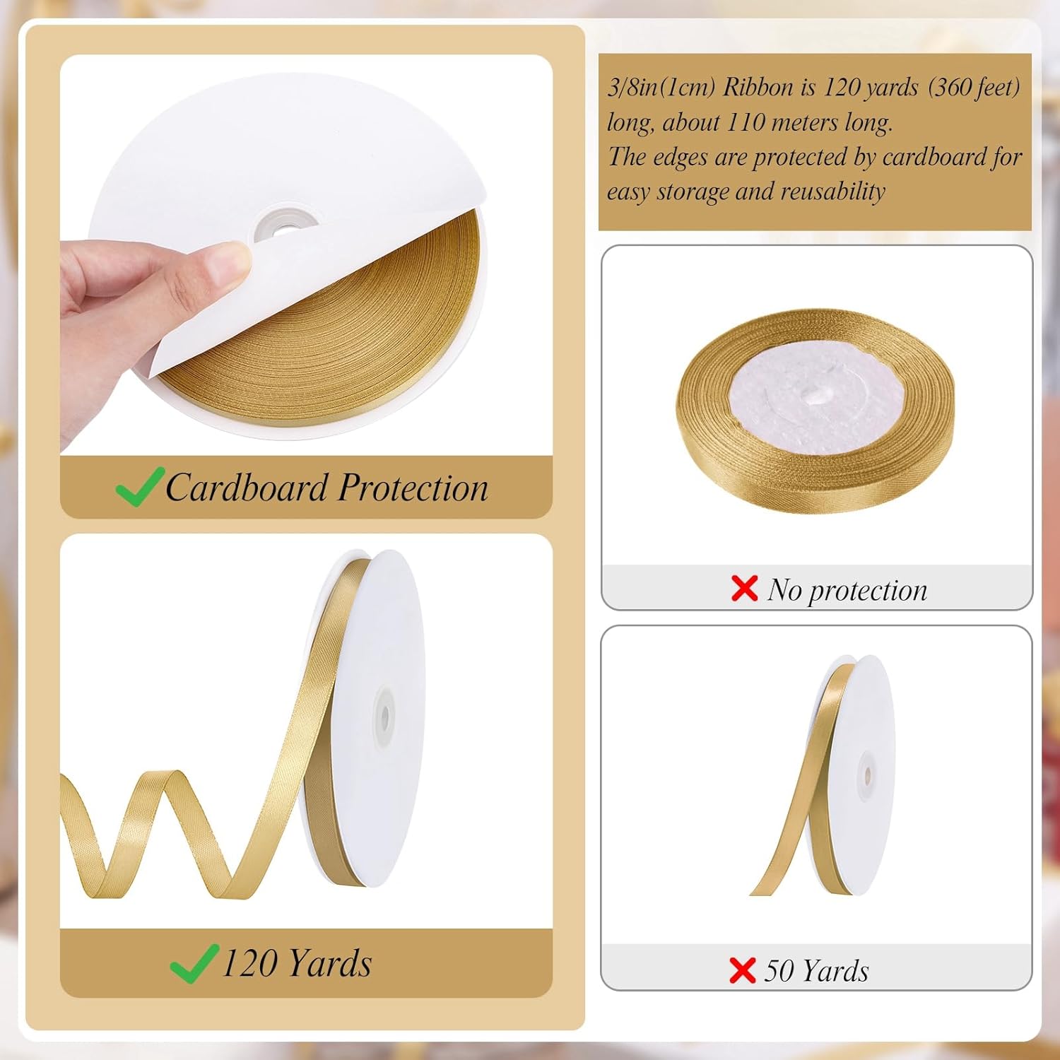 - 【Size Information】This thin gold satin ribbon is 3/8 inch(1cm) wide and 120 yards long; Because the ribbon is long enough, you can cut it at will to meet different decorative needs.