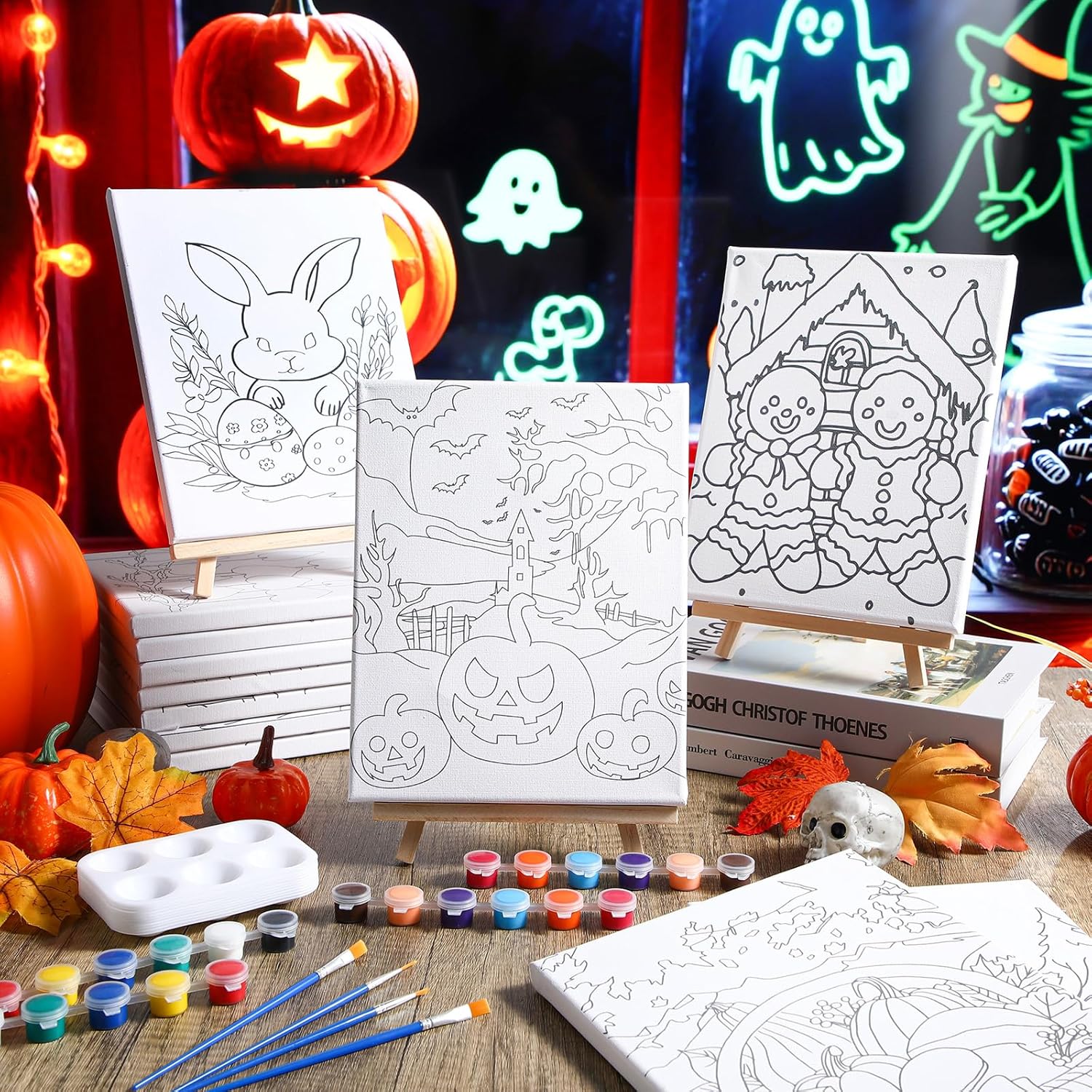 - Value Package: pre printed canvas for painting package includes 12 pre painted canvases, 12 paints in12 colors, 12 flat pen, 12 pointed pen, 12 palettes in 6 colors, 12 wooden easels; Whether you have an art party or just want to relax and paint, canvas with pictures to paint has got you covered; Note: the paint set is placed in the back of the drawing board
