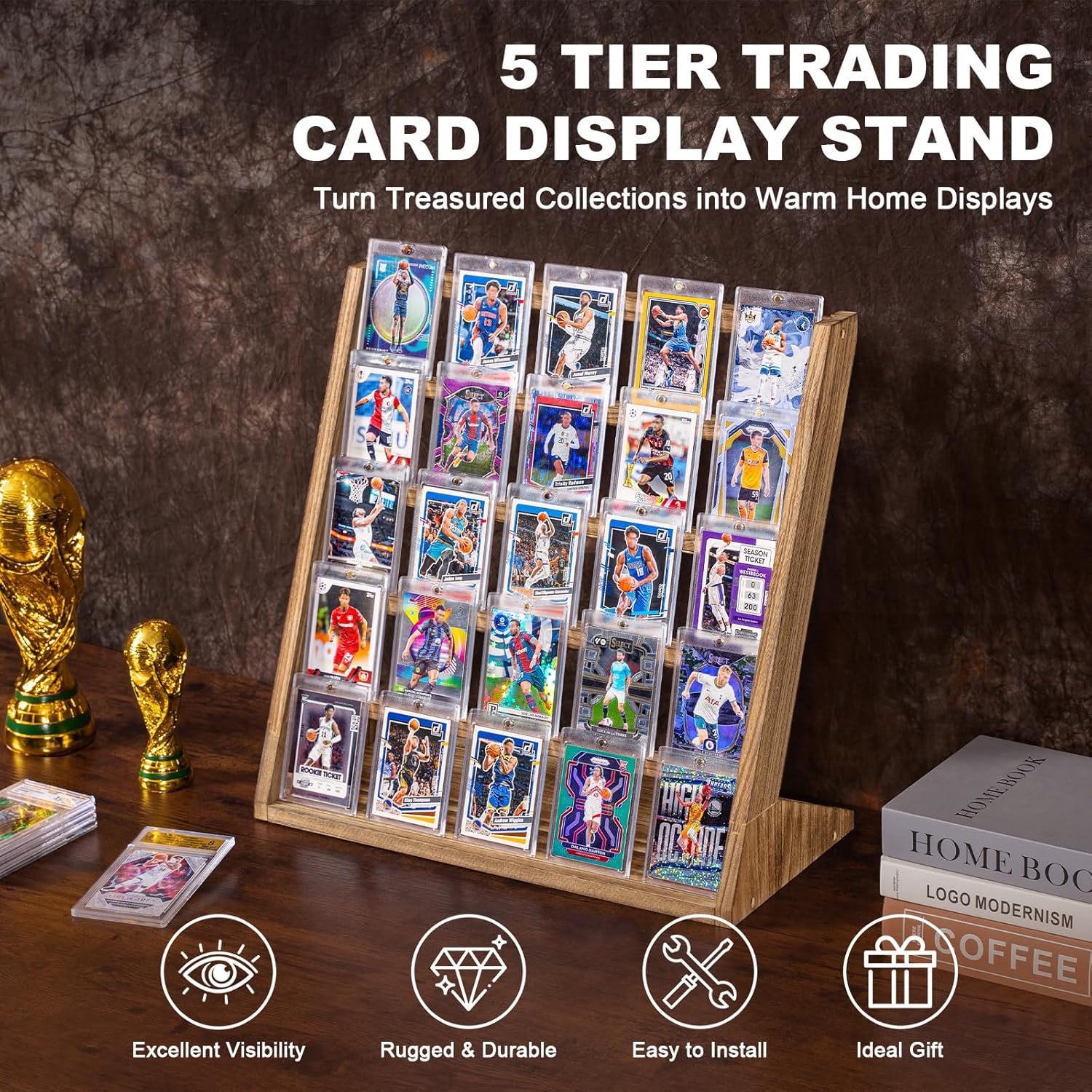 - Wooden Trading Card Display Stand: Crafted from premium solid wood, this 5 tier graded card display combines strength with timeless style. The rustic-style finish and wood grain create a warm, vintage-inspired backdrop that makes every card stand out like a showpiece (Size:18.11"x18.11"x8.27")