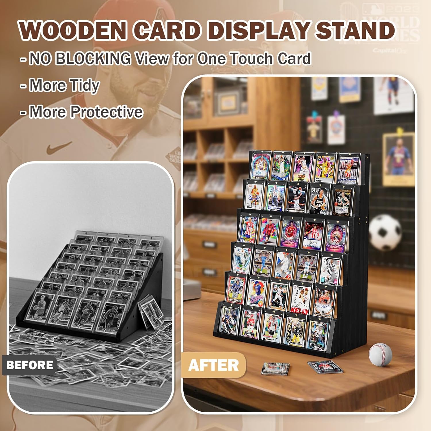 - RUSTIC TRADING CARD DISPLAY: The six-tier wooden card display stand is made of solid wood with a rustic vintage-inspired aesthetic. The unique tiered design allows for optimal viewing angles, ensuring that your prized one touch display are elegantly presented without obstruction. Your collection is as much about enjoyment as it is about organization. The size of card display: 17.7”L x 9.05”W x 24”H