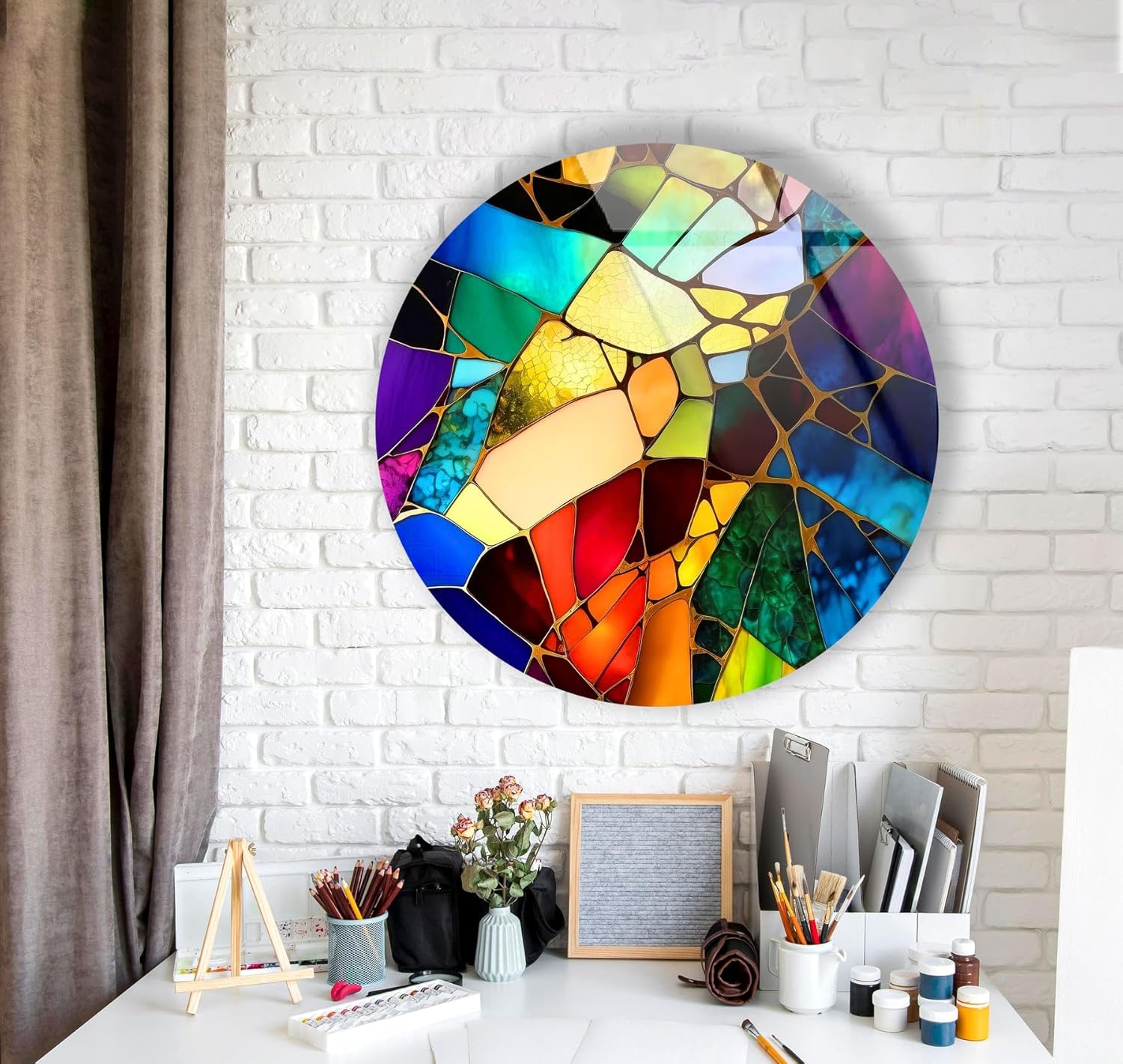 My Photostation.com 39,4''(100cm) Diameter Multicolor Round Stained Glass Wall Art Vibrant Mosaic Abstract Panel Tempered Glass Printing Wall Decor Large Wall Art Wall Hangings