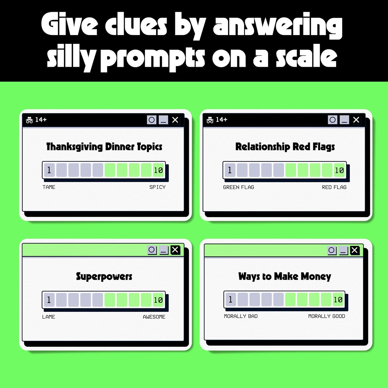 - π£οΈ GIVE CLUES BY ON A SCALE: Answer silly prompts by placing things on a scale: What is an β8β superpower on a scale of Underpowered (1) to Overpowered (10)?