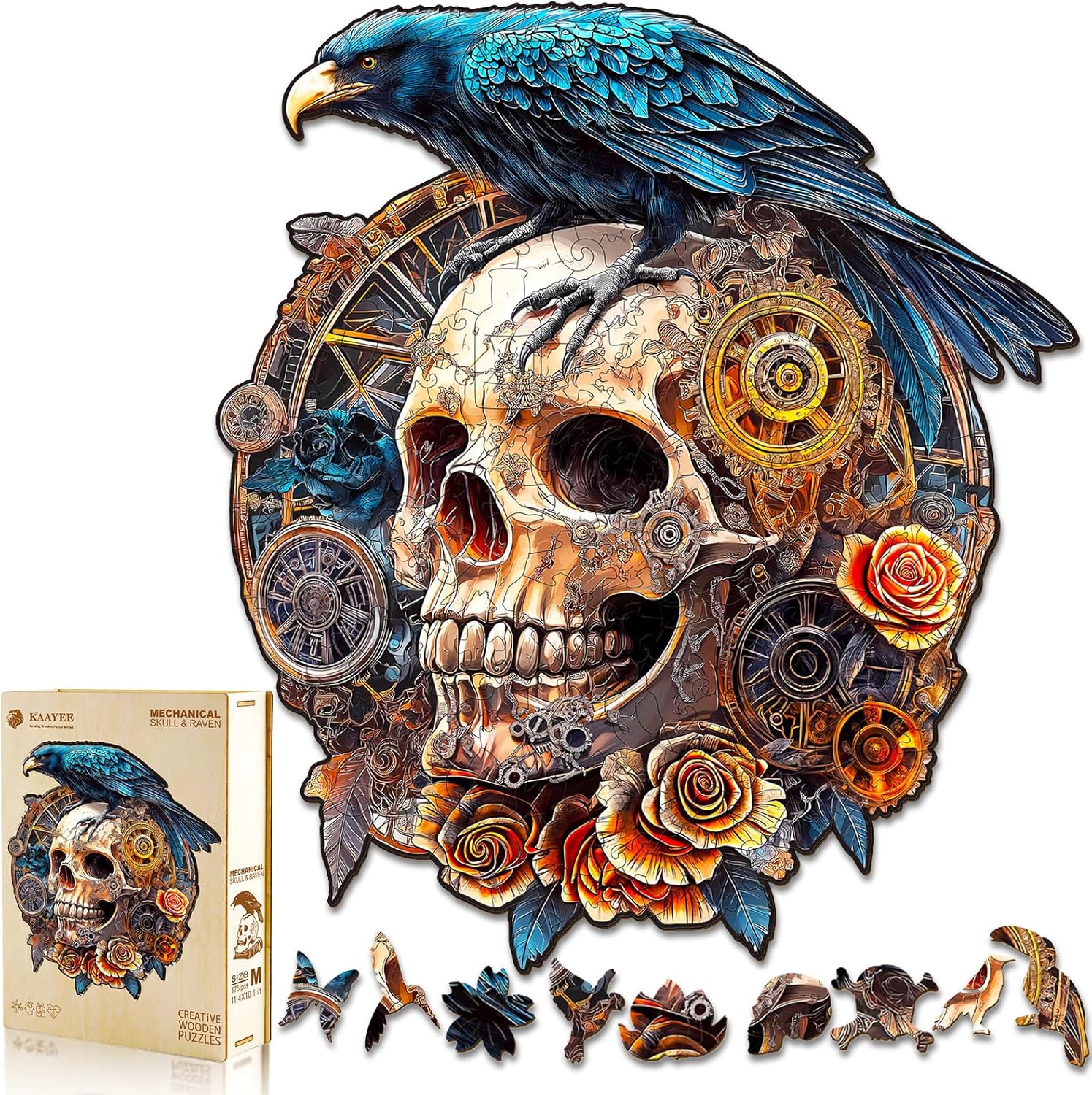 KAAYEE Wooden Puzzles for Adults, Raven & Mechanical Skull Wooden Jigsaw Puzzle 355 PCS Unique Shape Wood Puzzles Adult, 3D Visual Effect Flat Puzzle Birthday Gifts Family Games (XL-17.3 * 15.4in)