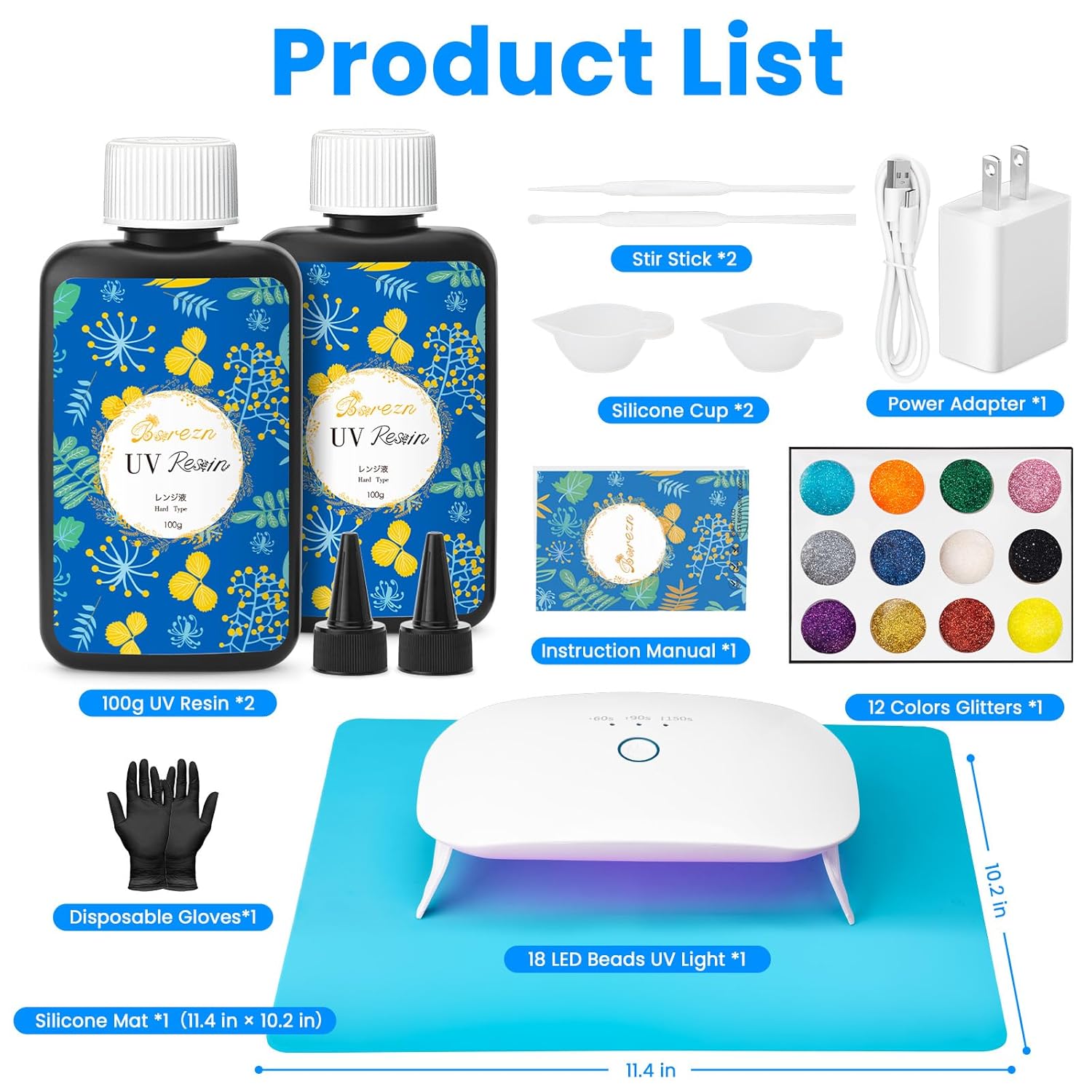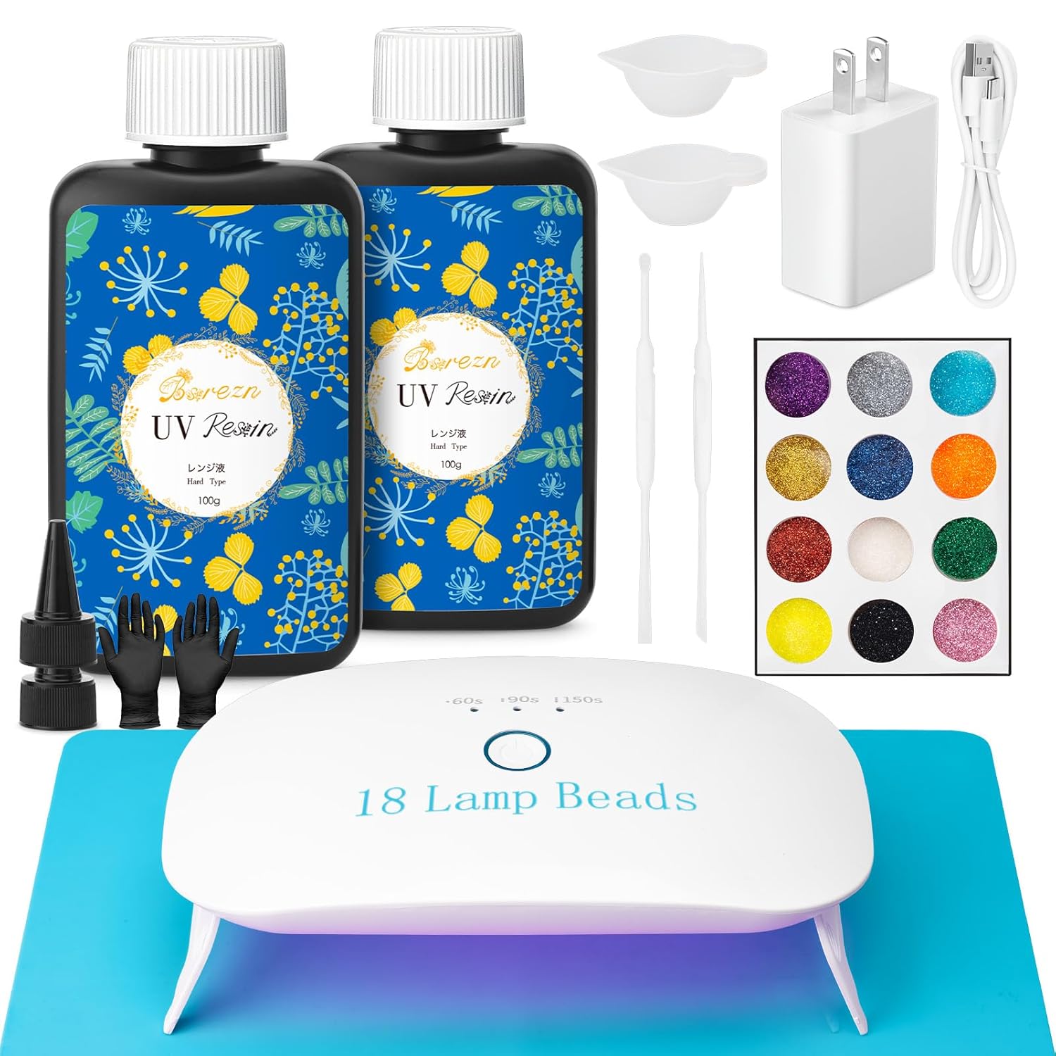- ALL-IN-ONE STARTER KIT: The UV resin kit includes: 2 x 100g UV Resin, 1 x 18-bead UV Light, 1 x Silicone Mat, 12-color glitter, 2 pairs of Disposable Gloves,1 x silicone cup, stirring rod. One UV resin kit with light sufficient to get you started on your resin journey.