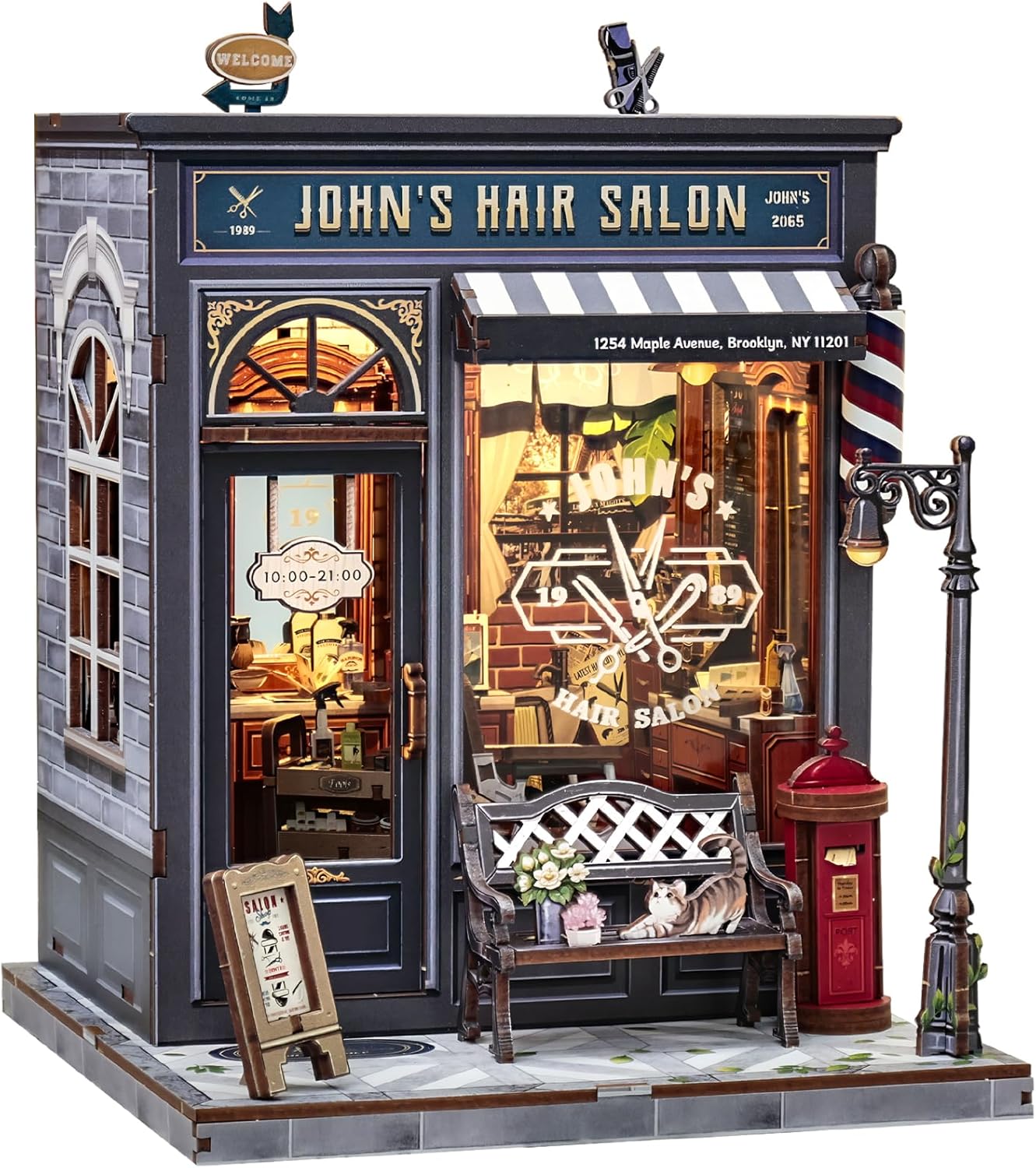 CUTEBEE Book Nook Kit - DIY Miniature House Dollhouse Kit for Adults, Booknook Hair Salon Barbershop Tiny House Bookshelf Decor 3D Wooden Puzzle, Gifts for Family and Friends (John's Hair Salon)
