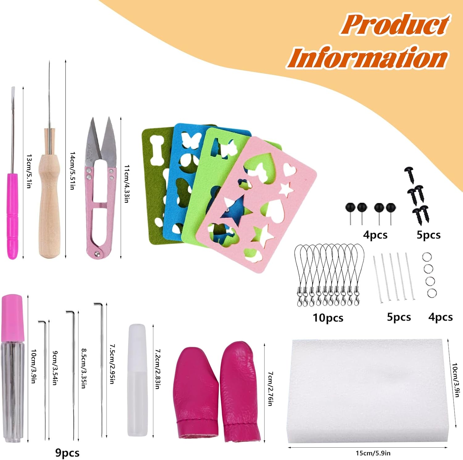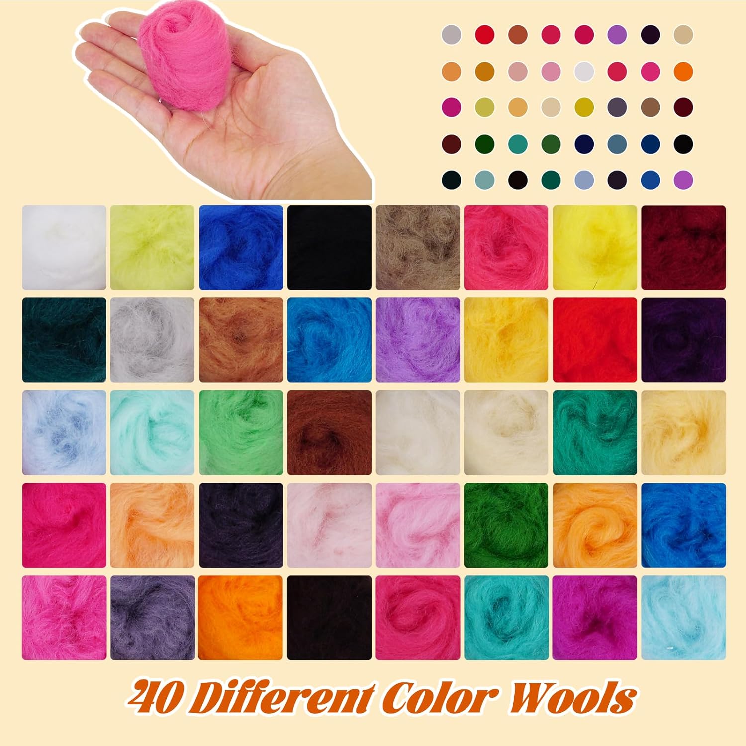 - 【Complete Needle Felting Kit for Endless Creativity】This comprehensive kit includes everything you need to start your felting journey: 40 vibrant wool roving colors, 9 felting needles (3 each in small, medium, and coarse), 8 plastic eyes, 5 plastic noses, 5 durable T-shaped needles, 5 colorful rope chains, 4 versatile wool molds, a wooden handle, finger guards, tweezers, a yarn cutter, a foam pad, a glue bottle, an awl, and a convenient needle bottle. Perfect for beginners and DIY enthusiasts!