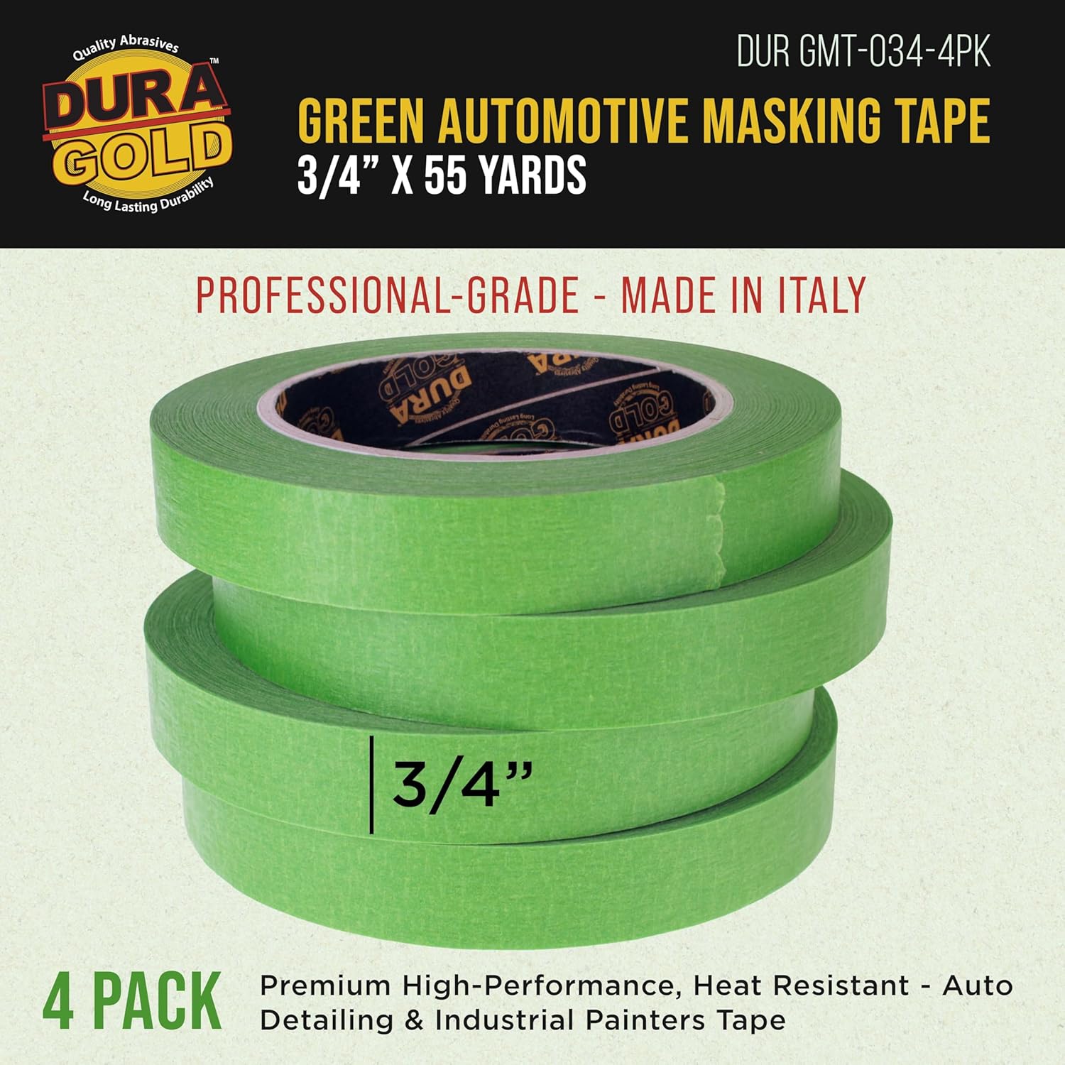 Dura-Gold Green Automotive Masking Tape 3/4 Inch (0.7 Inch x 55 Yards), 4 Rolls - Premium High-Performance, Heat Resistant - Auto Refinish Painting, Car Detailing, Autobody, Industrial, Painters Tape