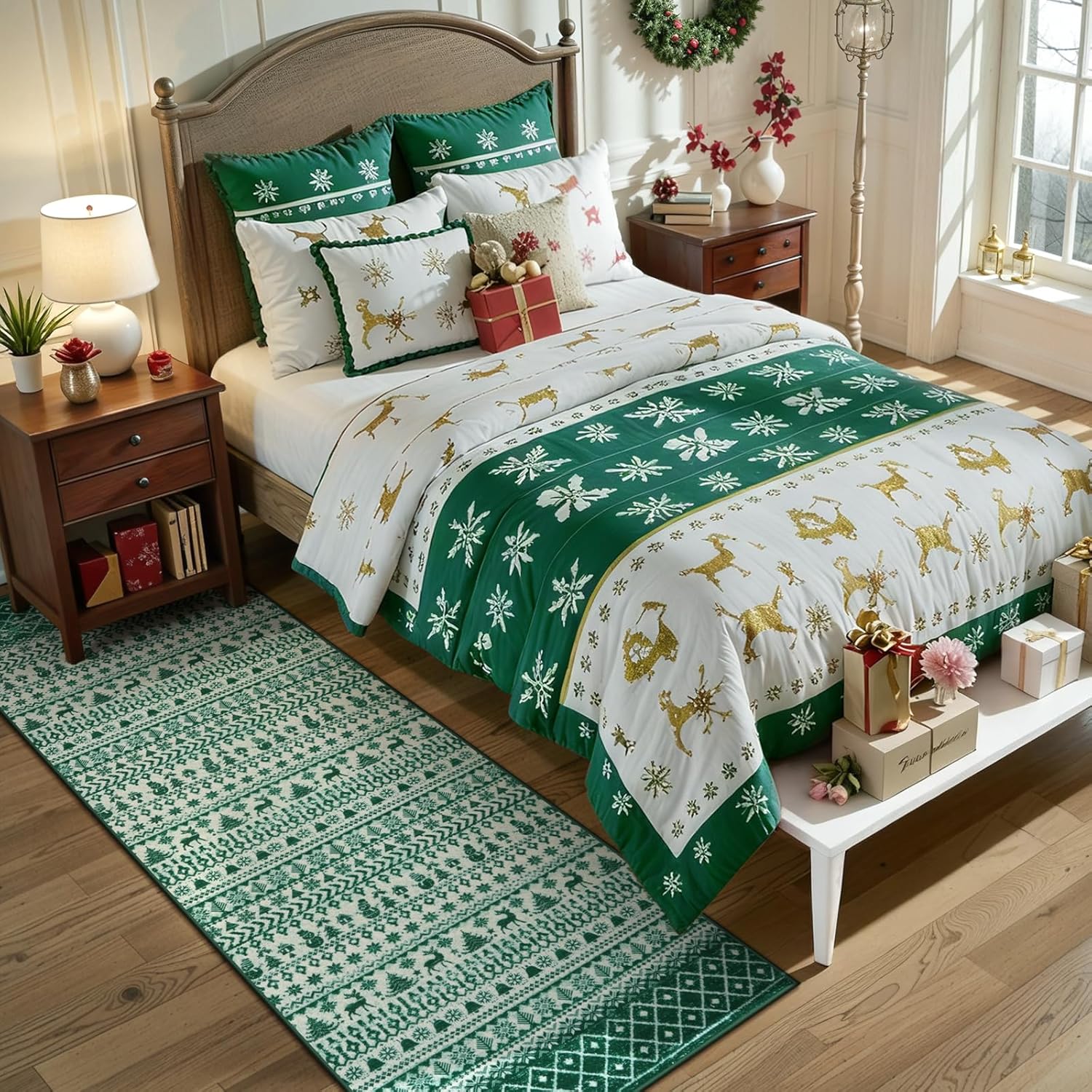 - Christmas Decor Rug: Inspired by Nordic Fair Isle sweater patterns, this festive rug showcases reindeer, snowflakes, trees, and snowmen in red and green. The distressed finish adds vintage charm, creating a warm and cozy holiday atmosphere at home